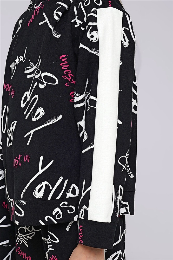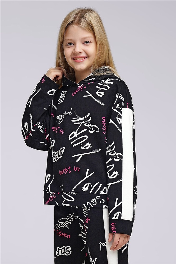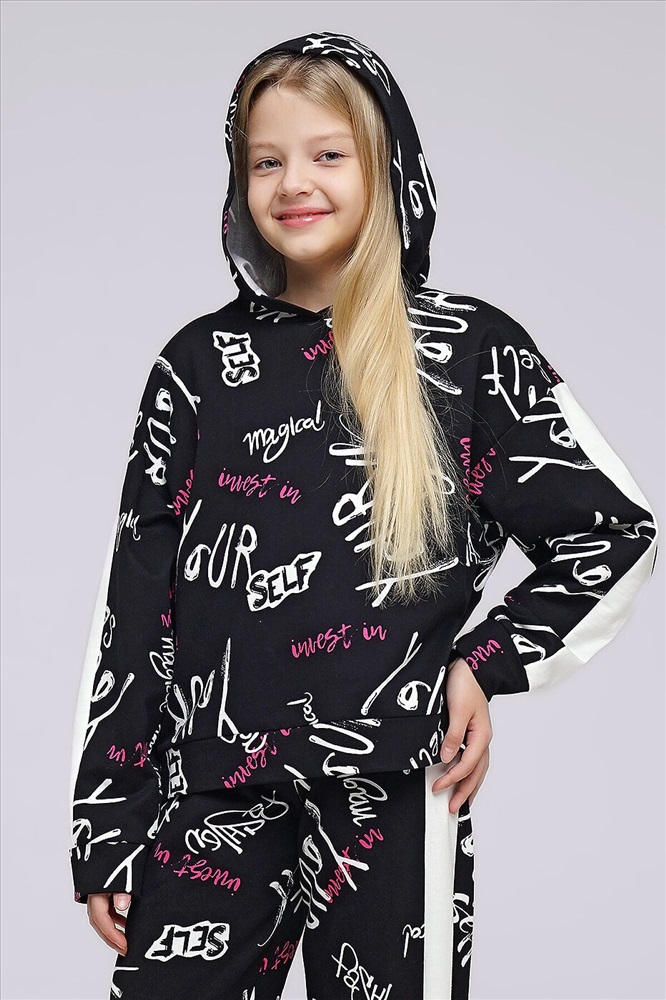 Стильный объёмный свитшот с капюшоном из футера. Набивная модель в сочетании с однотонными вставками по рукаву легко впишется в повседневный лук, сделает твой образ ярким и незабываемым.