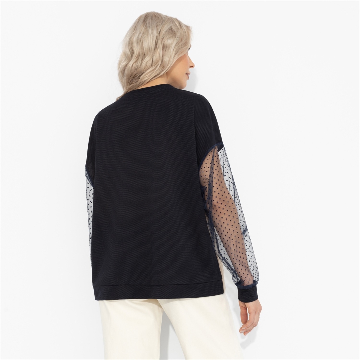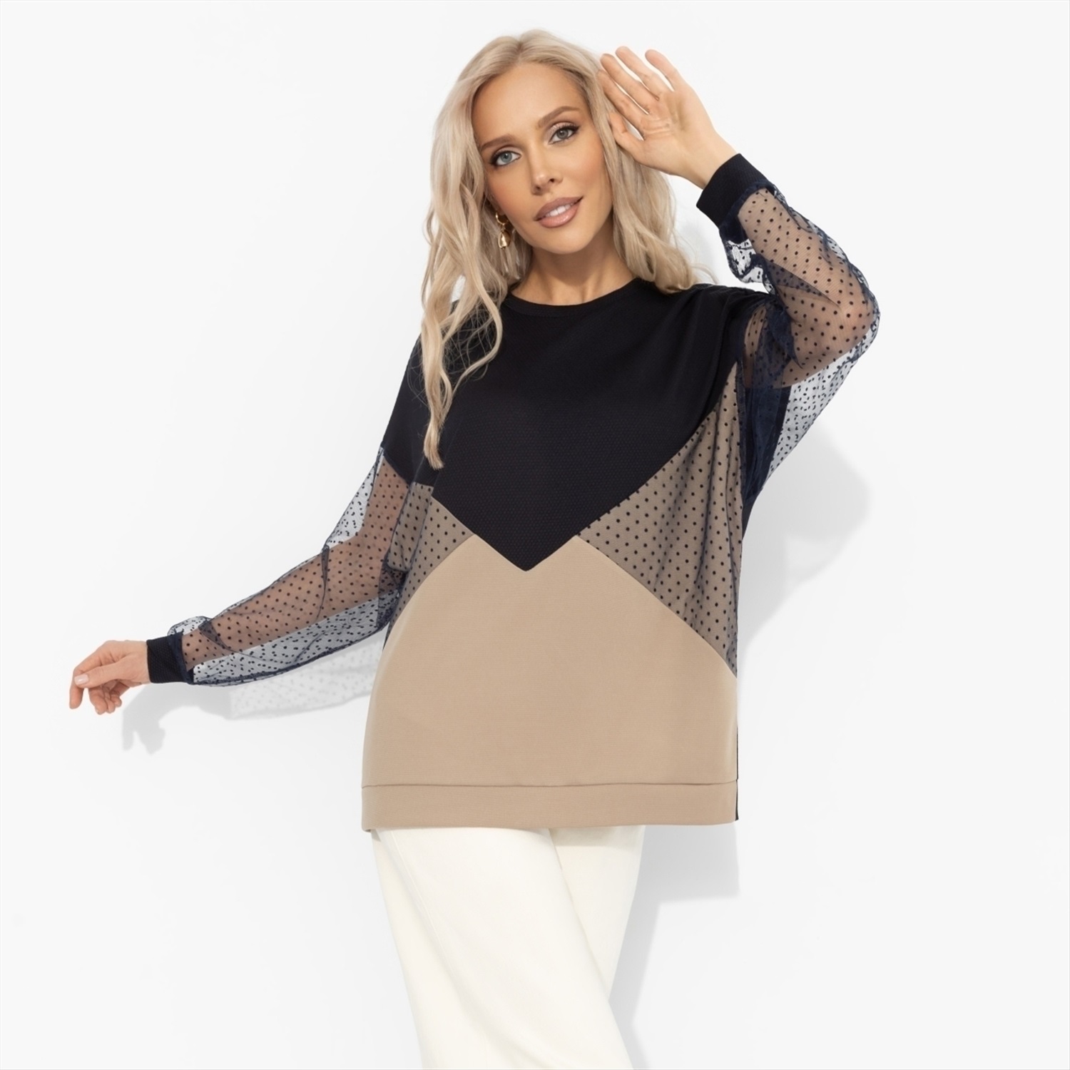 Кофе с подругой, прогулка по парку или день, когда просто хочется быть собой. Мягкий свитшот сочетает уют и лёгкий флирт – прозрачная сетка флак добавляет игре оттенков немного загадочности. Свободный силуэт, трендовая геометрия и благородные тона делают этот образ тем самым – любимым и комфортным. Свитшот свободной посадки. Комментарии к товару