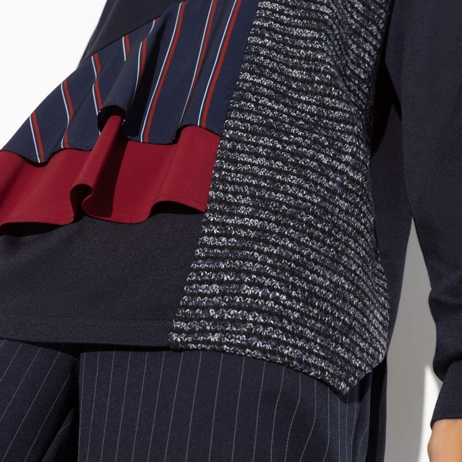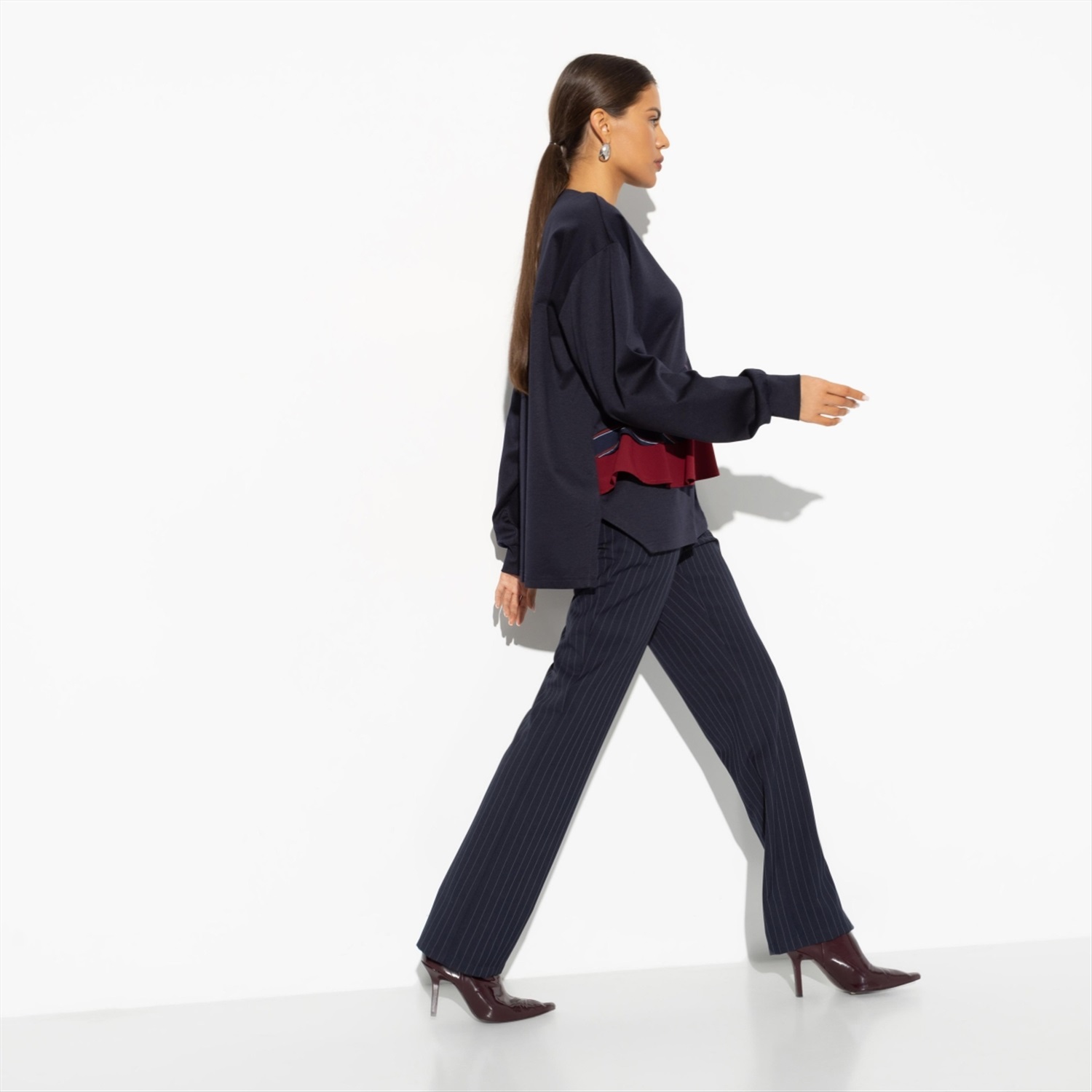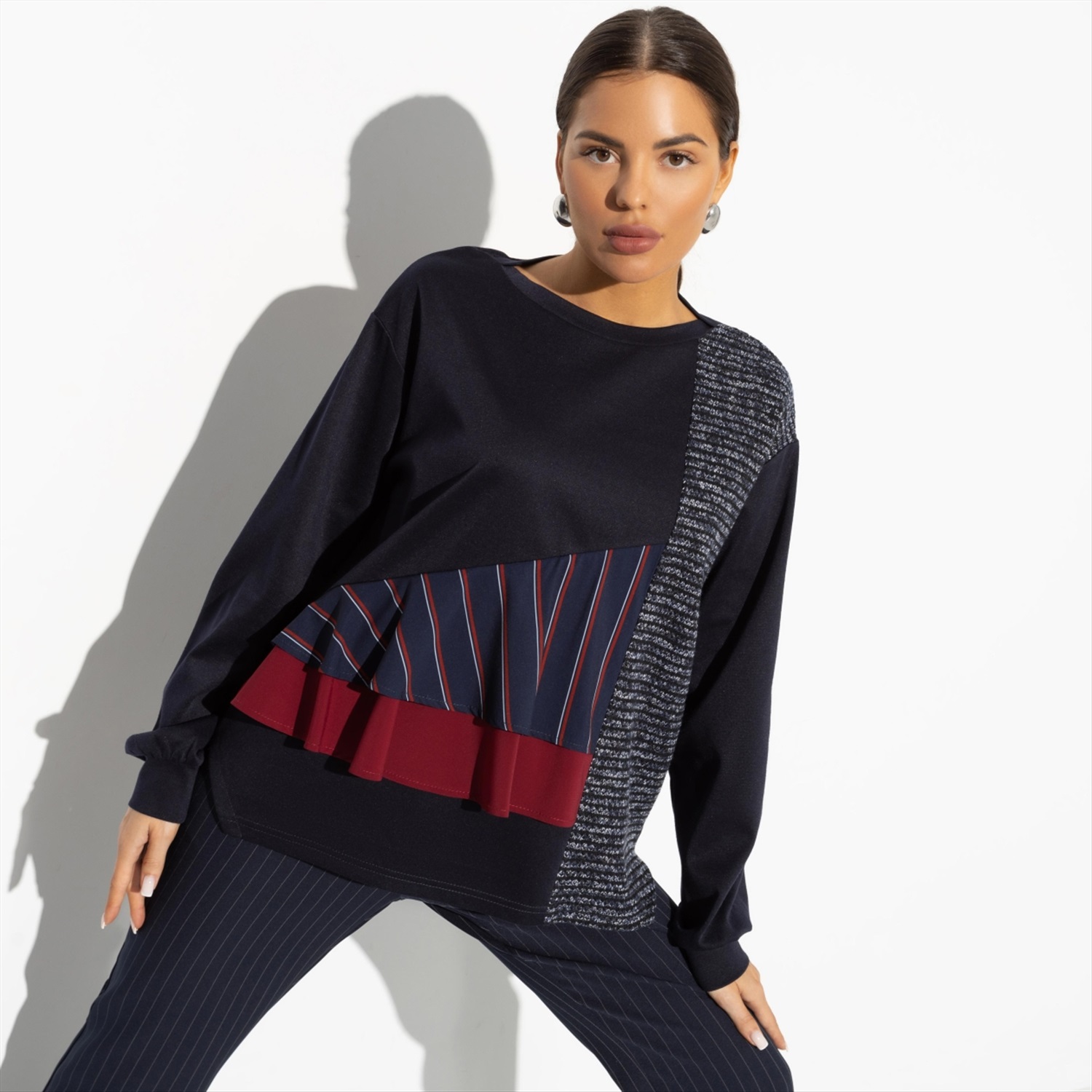 Молодые, свободные и дерзкие - мы едем по трассе, наматывая бесконечные километры глубоких разговоров. Ты открываешь окно, запуская хваткую лапу ветра внутрь. Но тебе не страшно. Свитшот в цвете глубокой ночи с деталям винного цвета защищает тебя от любых невзгод. Свитшот свободного кроя. Длина до середины бедра. Легкая асимметрия между передней и задней частью изделия. Свитшот сшит из разных видов ткани. Есть объемные рюши спереди.