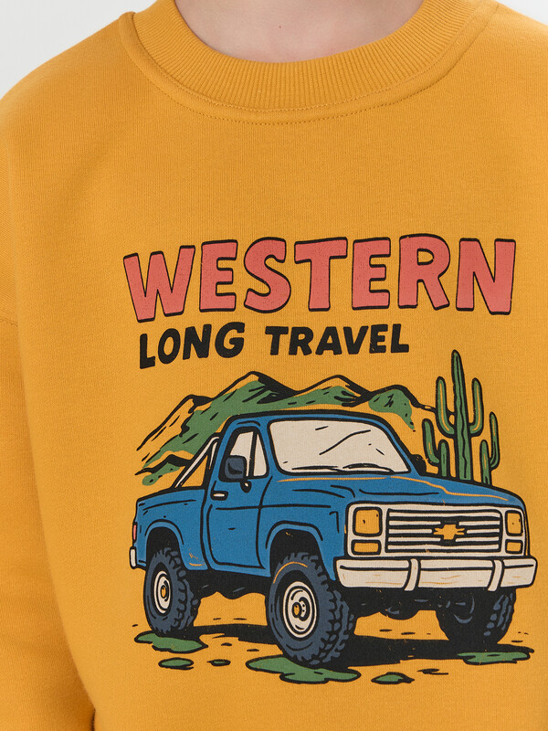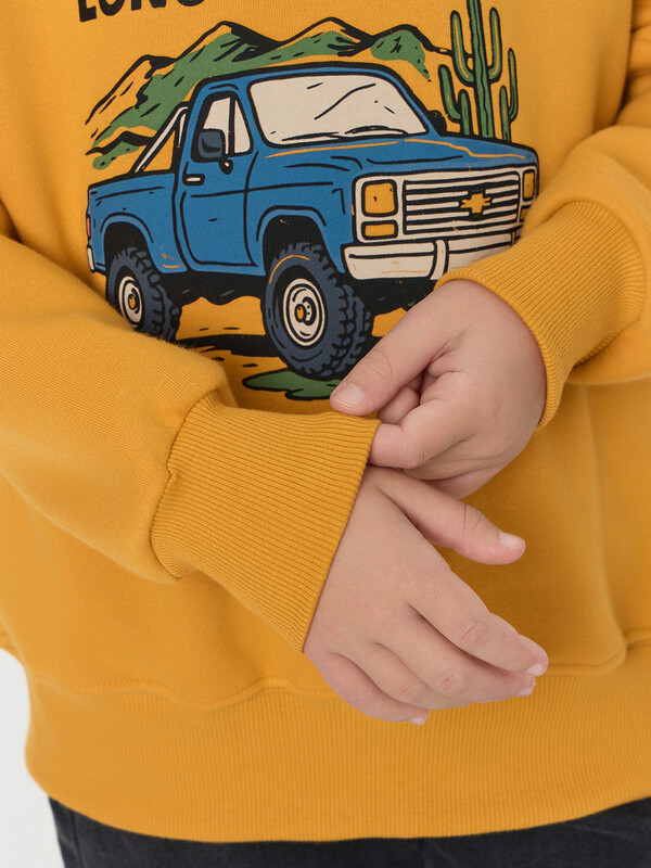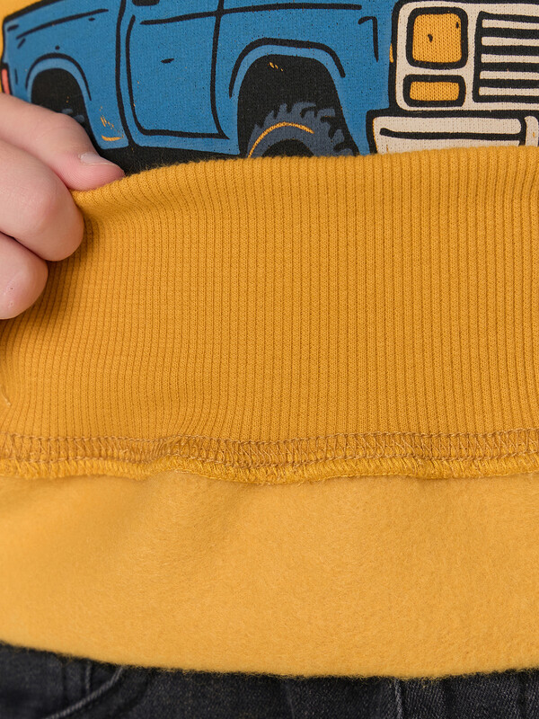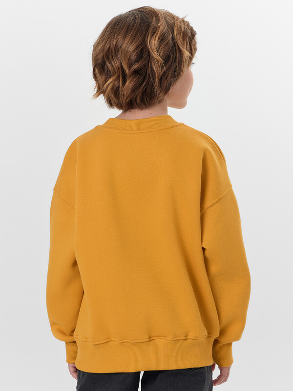 Свитшот свободного силуэта. Рукава длинные, втачные. Линия плеча спущена. По переду декоративное членение. Горловина круглой формы c окантовкой из трикотажного полотна рибаны. Низ рукавов и изделия обработаны трикотажным полотном рибана .