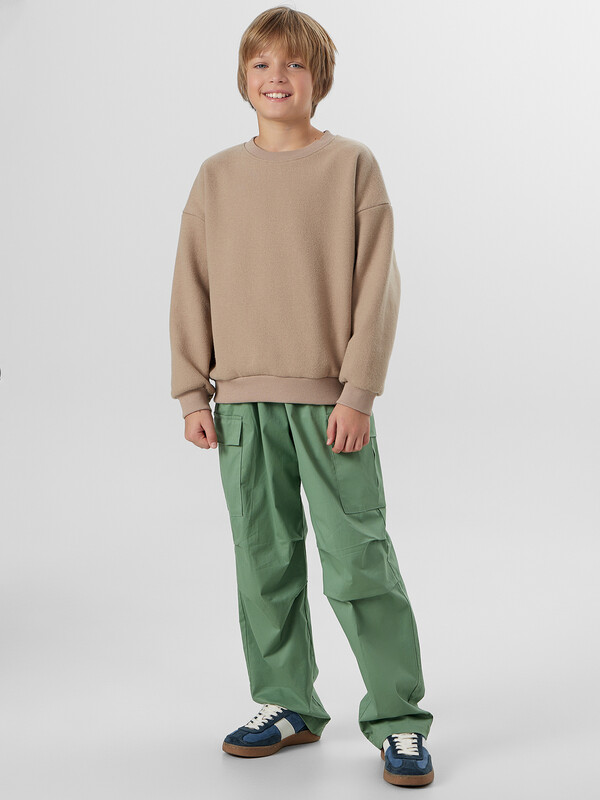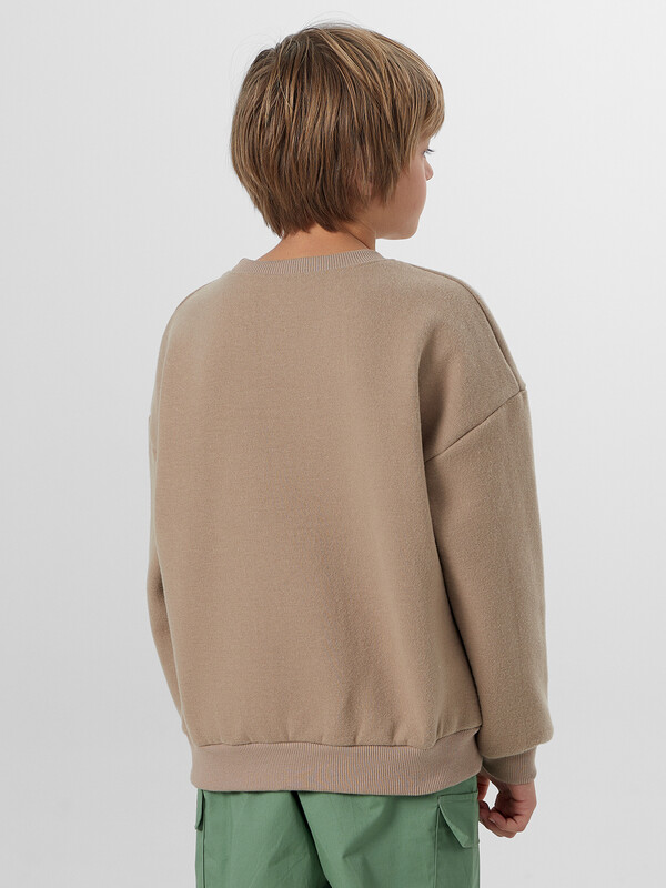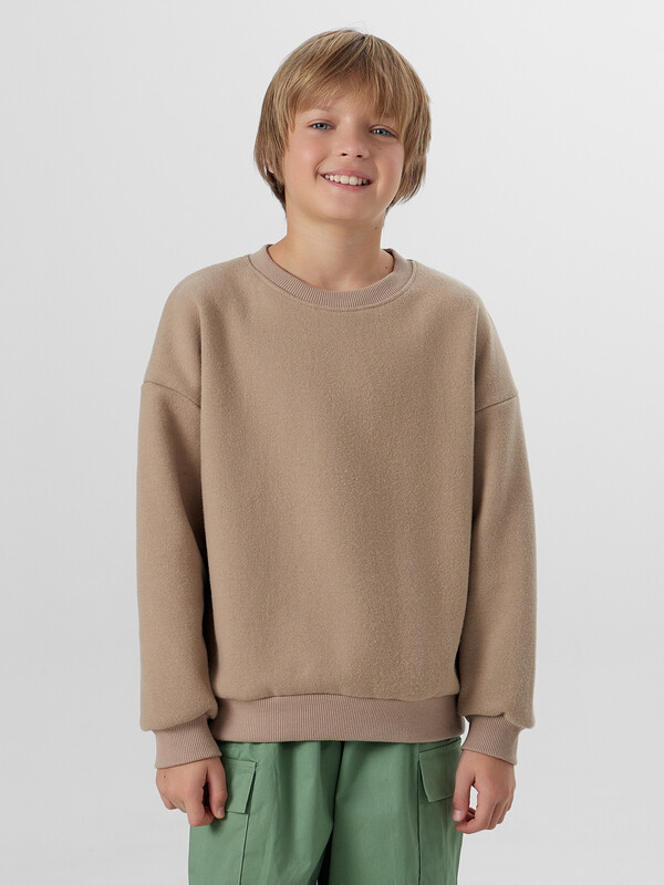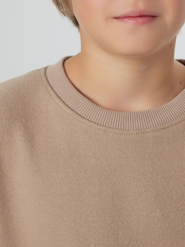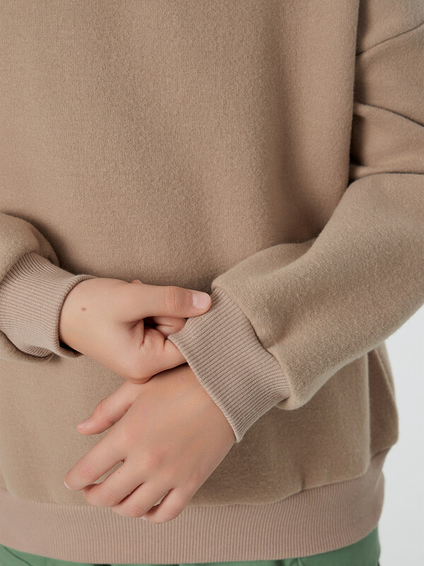Свитшот свободного силуэта. Рукава длинные, втачные. Линия плеча спущена. Перед и спинка цельнокроенные. Горловина круглой формы обработана обтачкой из рибаны. По низу рукавов и джемпера притачены манжеты и пояс из рибаны.