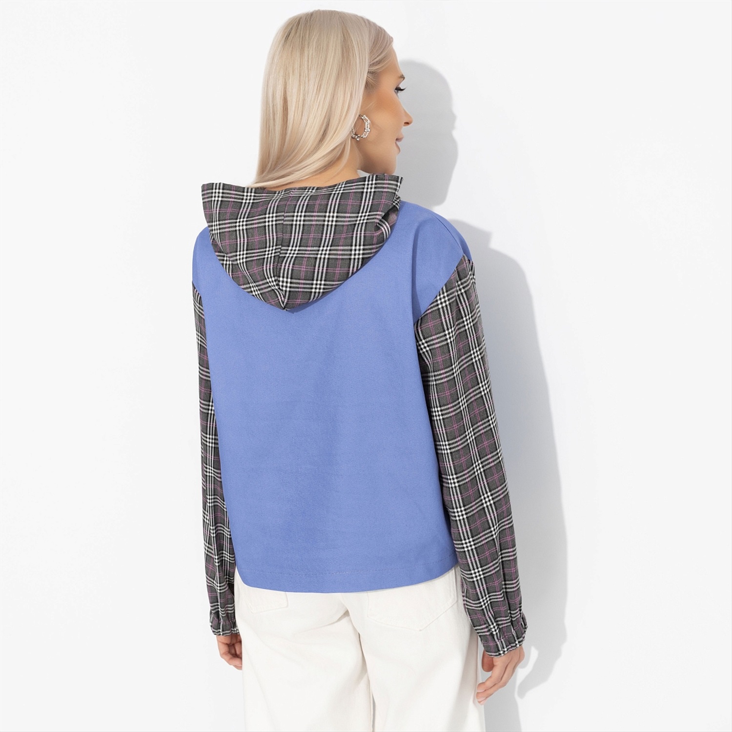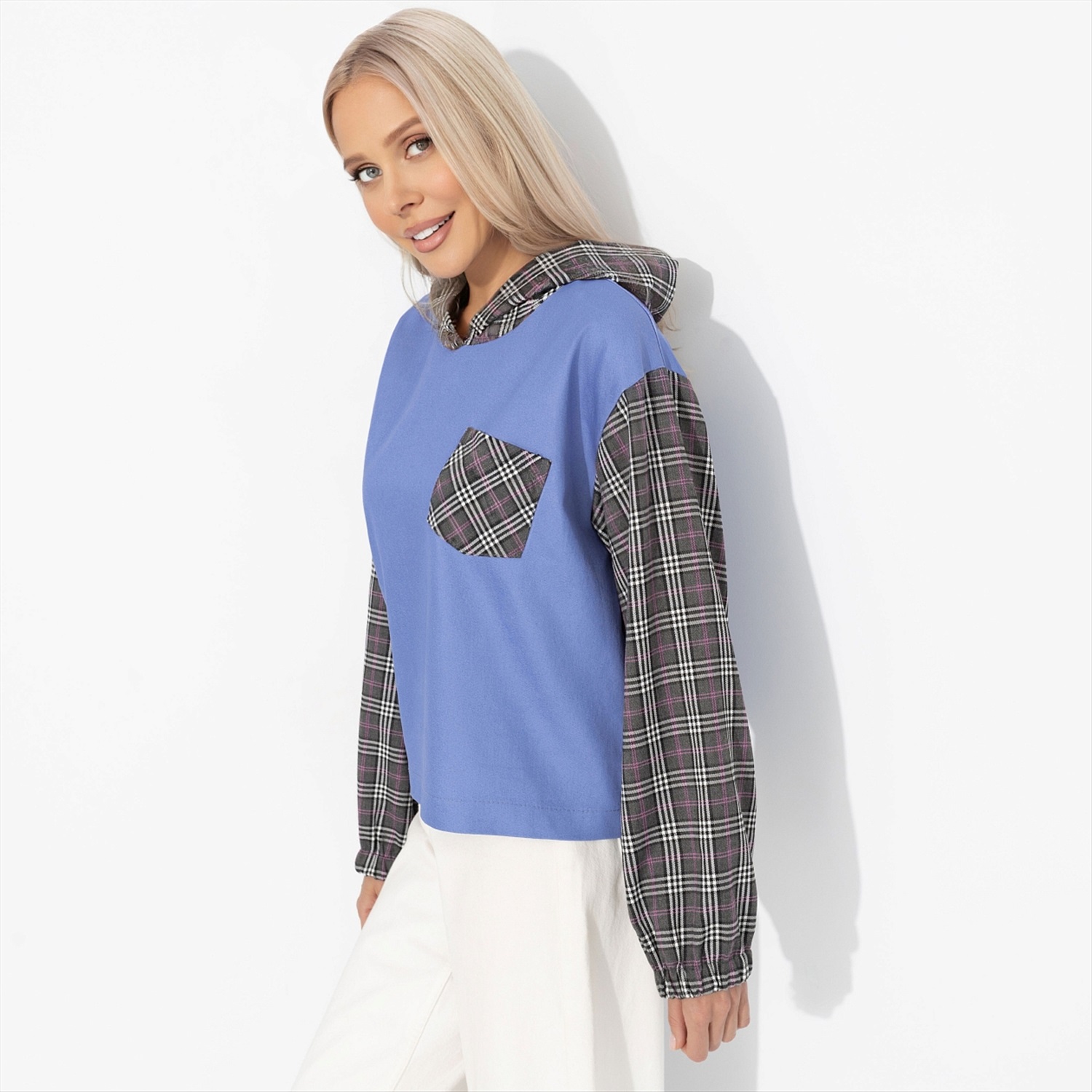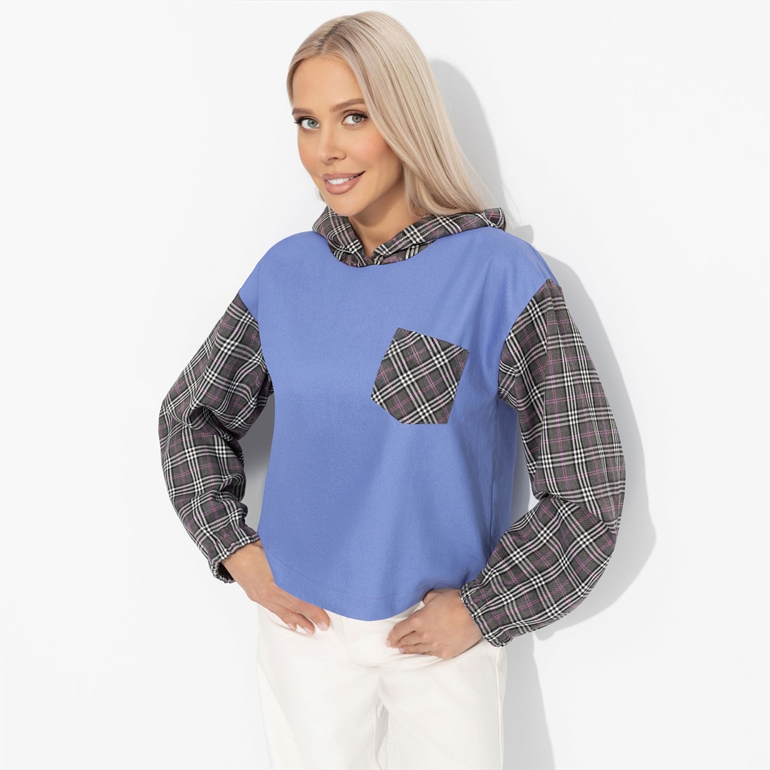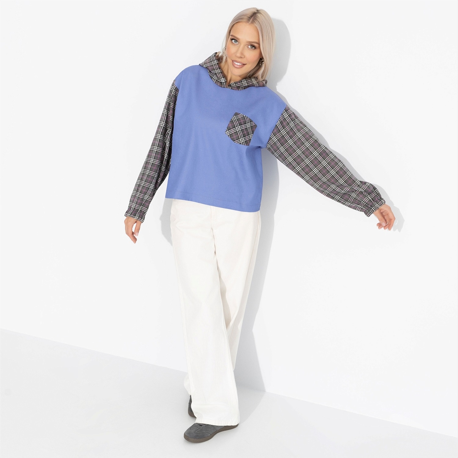 Она оделась в уютную клетку, как героиня её любимых ромкомов, где каждый квадратик свитшота — это кадр из истории о простом счастье. Это не просто узор, а наследие кинолегенд, где школьные коридоры и осенние свидания пахли попкорном и свободой. Свитшот станет униформой для тех, кто верит в хэппи-энды. Свитшот укороченный с капюшоном. Комбинация двух типов ткани. Рукава оформлены скрытой резинкой. Есть карманы.