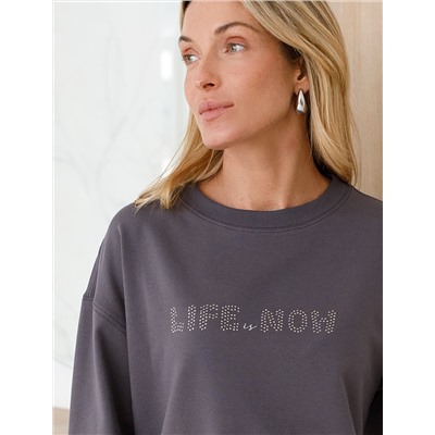 Свитшот выполнен из эластичного футера двухнитки. Изделие дополнили аппликацией из металлических страз. Перевод: Life is now - живи сейчас. Расслабленный стиль поддерживает спущенная линия плеча, свободный силуэт и разрезы по бокам. Модель сочетается в костюме с брюками D44.135, D44.136, D44.137 и юбкой D46.034