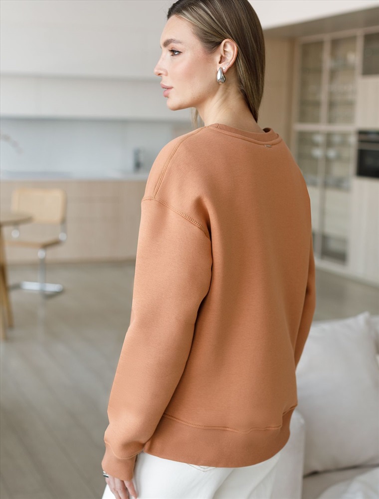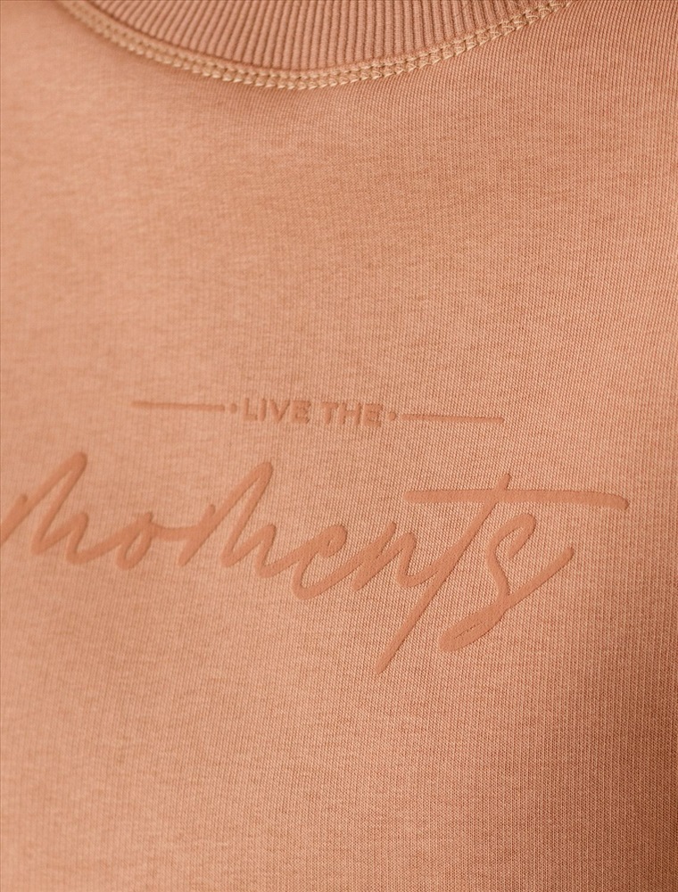 Свитшот с круглым воротом выполнен из премиального футера трехнитки с теплым начесом. Модель дополнена фактурным лаконичным принтом. Перевод: «Живи мгновениями». Свободный крой подходит для любой фигуры и впишется в любой гардероб.