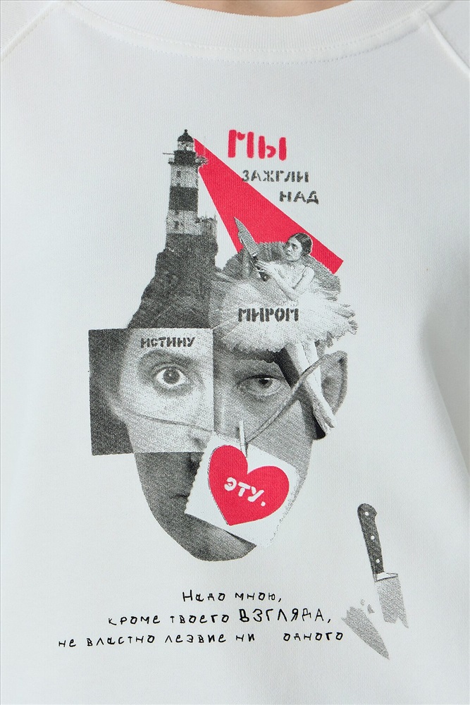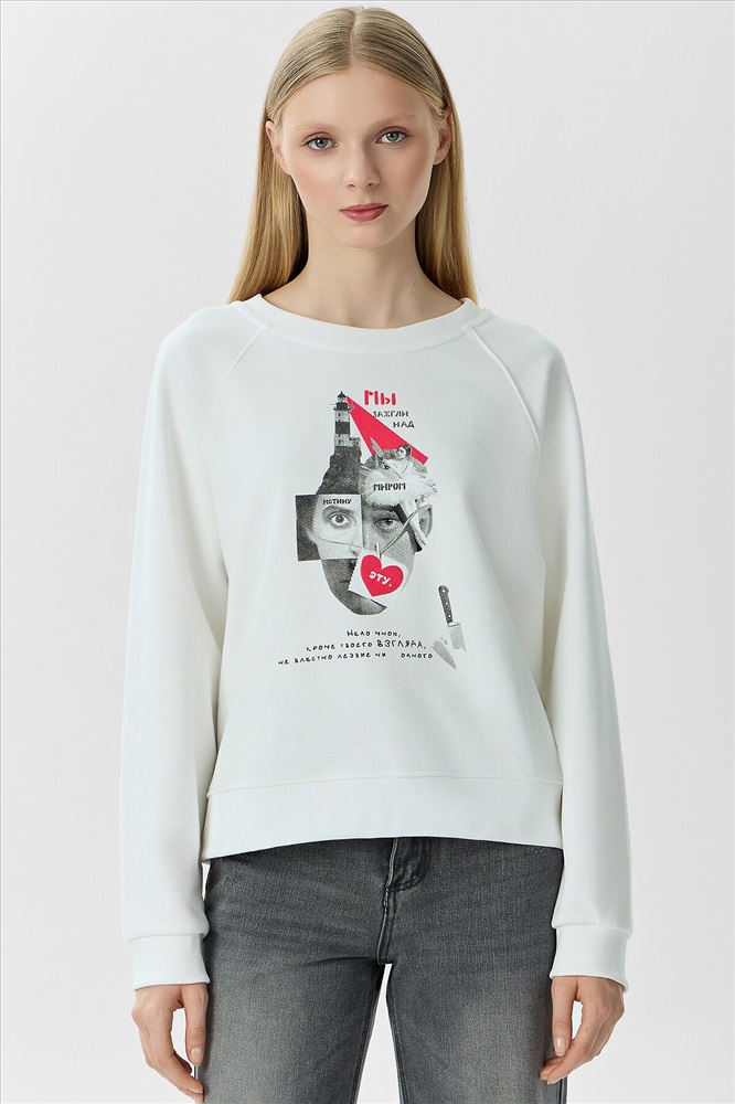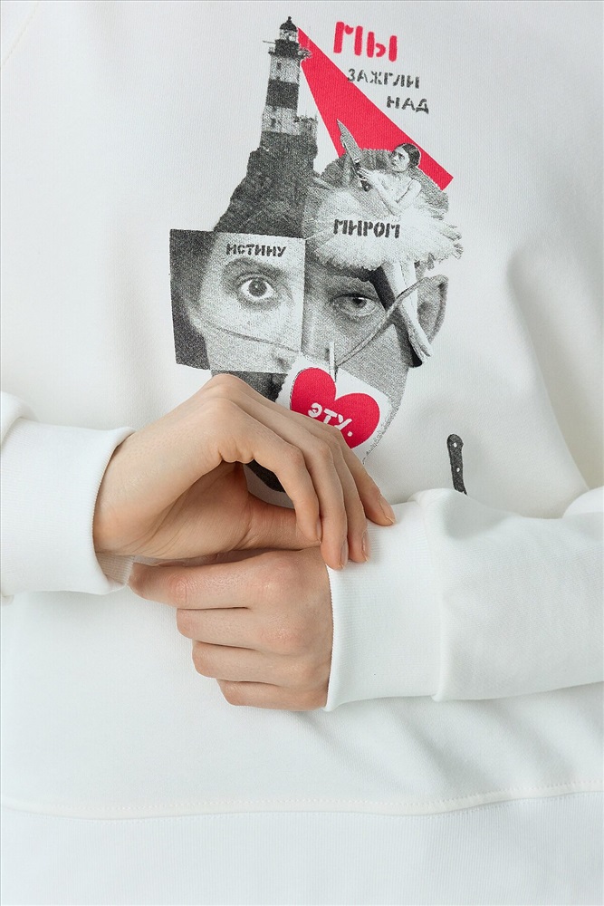 ID товара: 1134884 Состав: 100% Хлопок Сезон: Весна/Лето Длина: Средняя Фасон: Прямой Рукав: Длинные Вырез горловины: Округлый Рисунок: Надпись Декоративные элементы: Принт Утеплитель: Без утепления Основная ткань: Хлопок Стиль: Повседневный Уход: Деликатная стирка при 30 градусах Фактура материала: Футер Страна бренда: Беларусь Страна производства: Беларусь Свитшот свободного силуэта. Перед и спинка цельнокроеные. Горловина круглой формы, обработана обтачкой из основного полотна. Рукав реглан, длинный с манжетами из основного полотна. По низу изделия пояс из основного полотна. Комментарии к товару