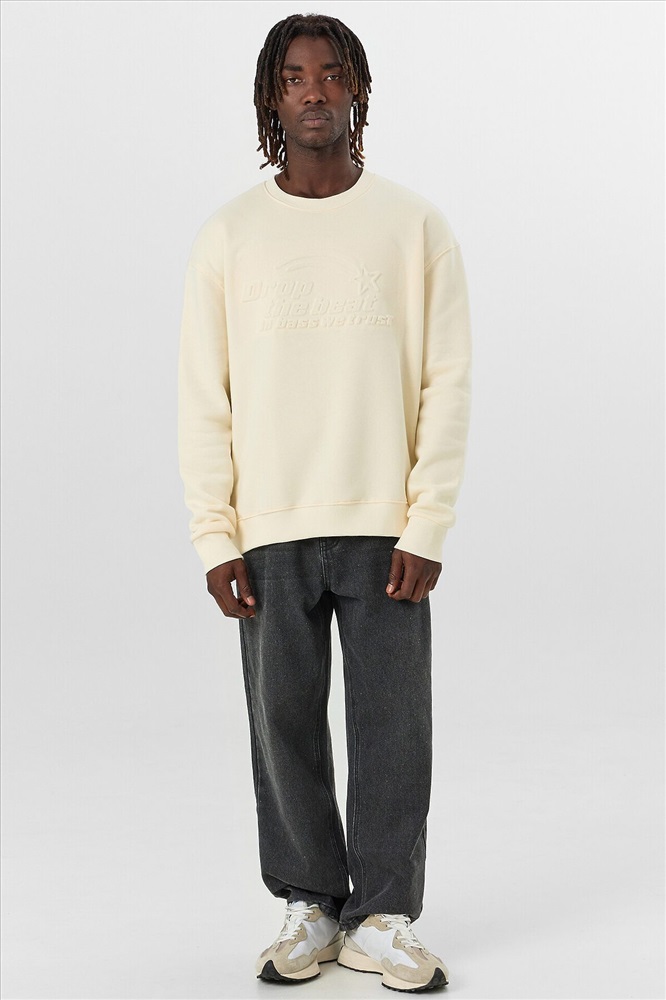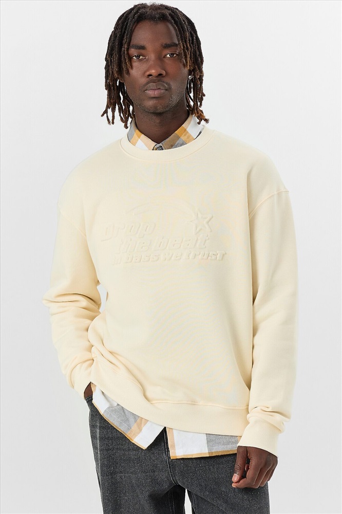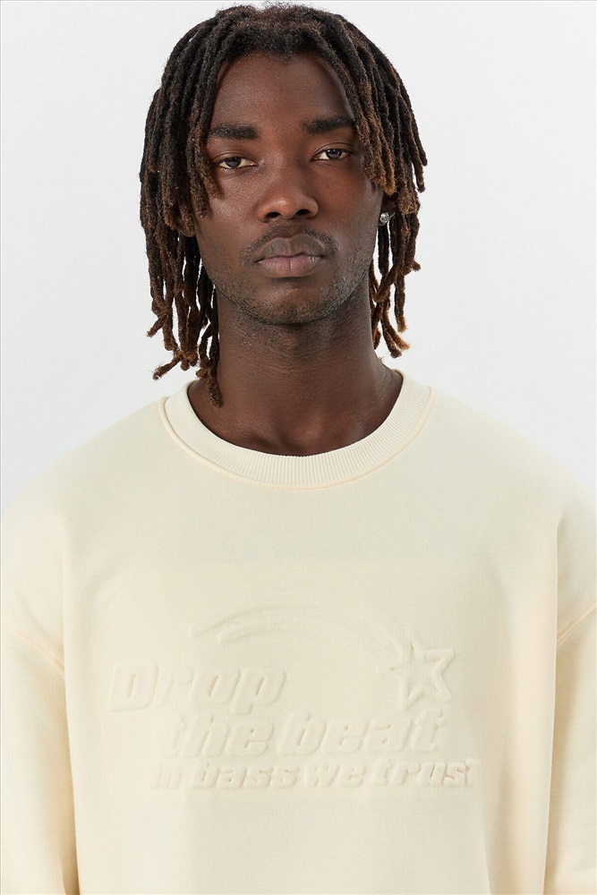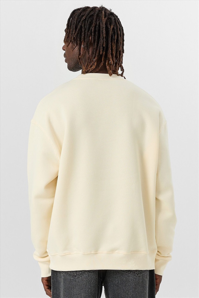 Свитшот прямого силуэта. Горловина округлой формы обработана обтачкой из рибаны. Шов втачивания обтачки по спинке закрыт тесьмой хб. Рукав втачной, длинный с отрезными манжетами из рибаны. Линия плеча слегка спущена. По низу свитшота отрезной пояс из рибаны.