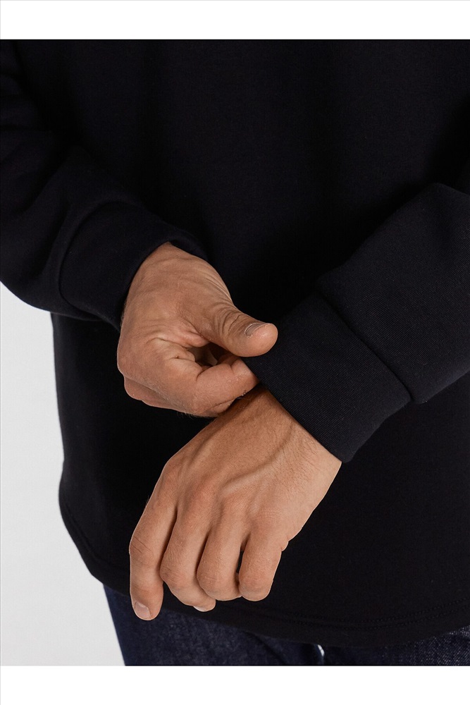 Джемпер изготовлен из трикотажного полотна футер. Горловина округлой формы с воротником стойкой из основного полотна. Шов втачивания горловины закрыт тесьмой хб. Рукава втачные длинные. Линия плача слегка спущена. По низу рукавов отрезные манжеты из основного полотна. По переду накладной карман кенгуру (ПО ЗАДАНИЮ) Центральная застежка на тесьму-молнию. Нижний срез фигурный, обработан швом вподгибку.