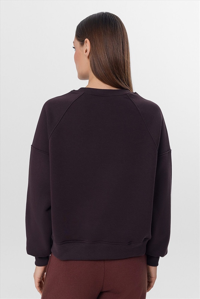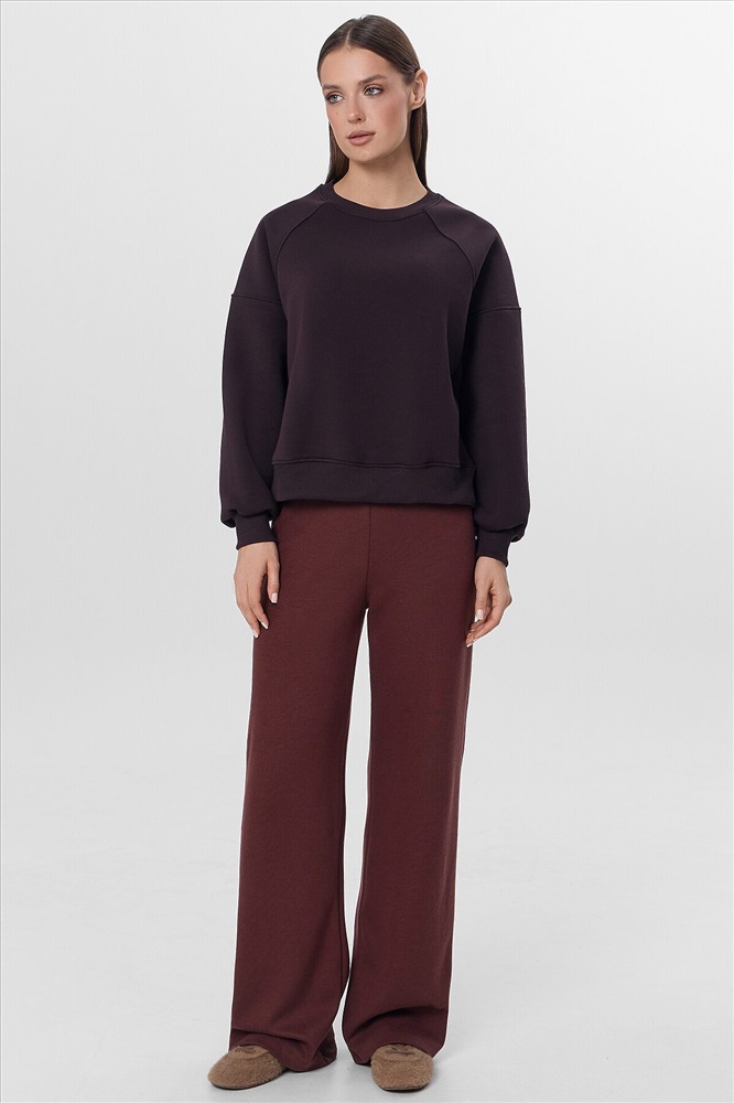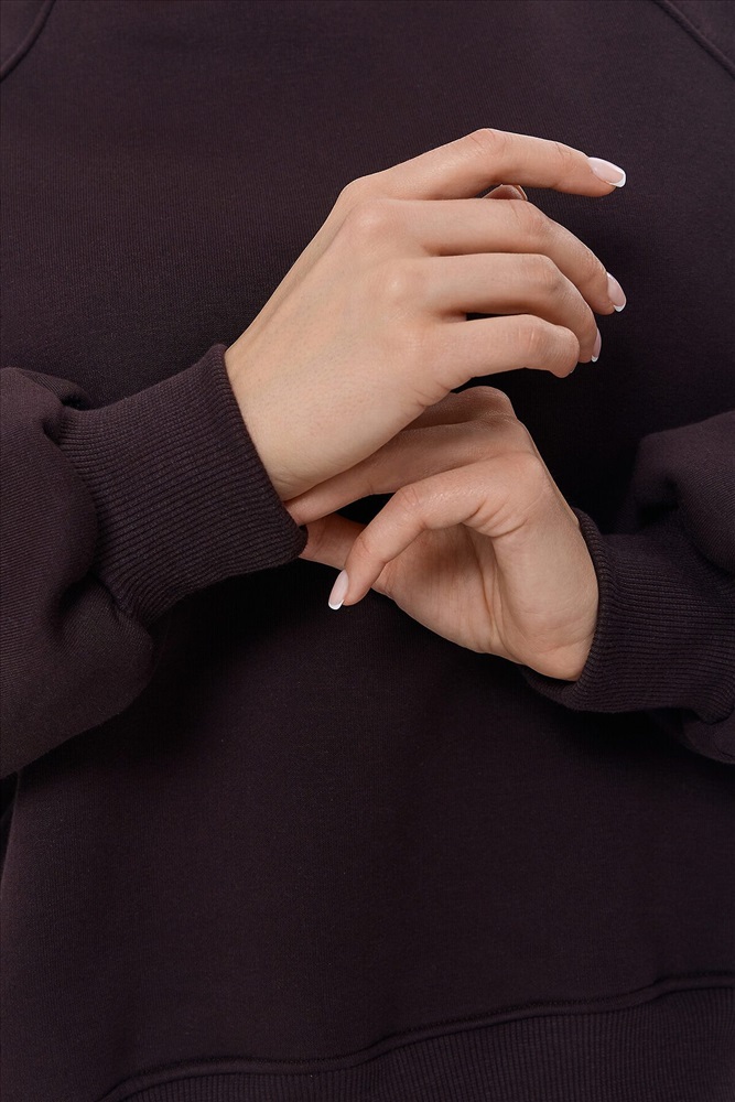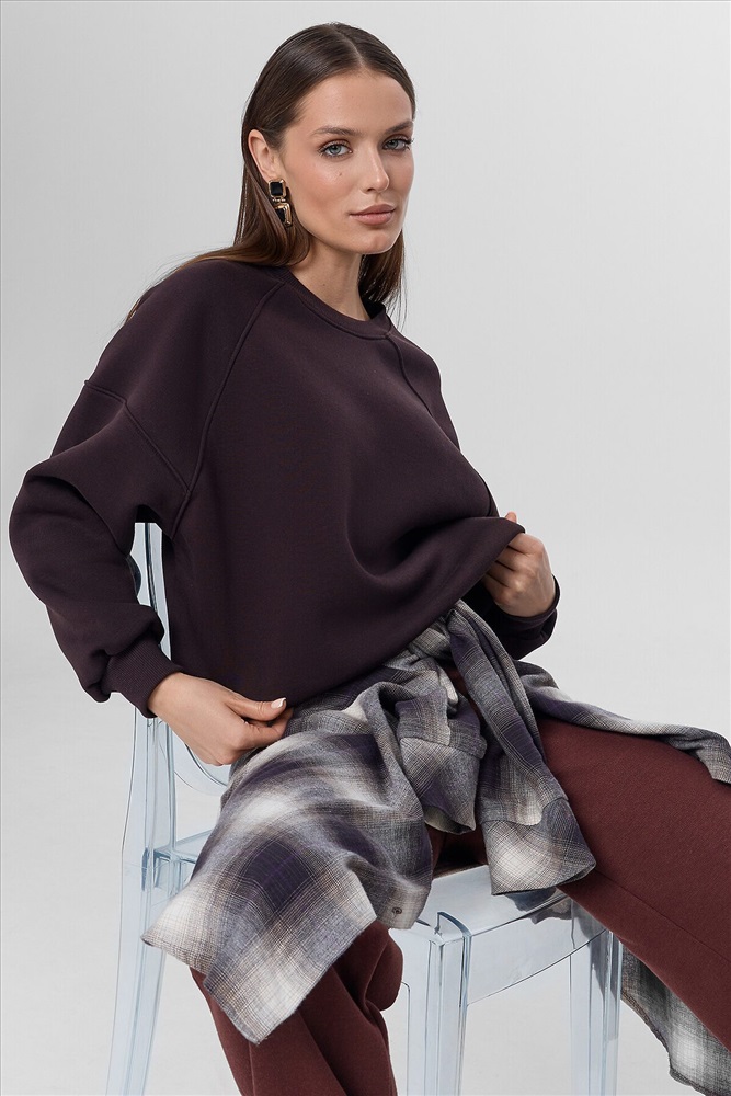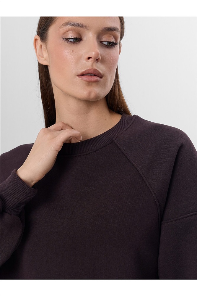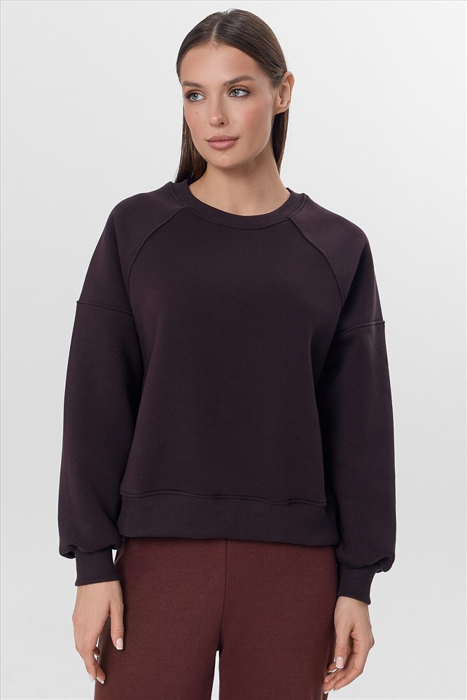 Объемный женский свитшот свободного силуэта из футера с теплым и нежным подчесом. Вырез классический, круглый. Рукава типа "реглан" со значительно спущенной линией плеча дарят особый комфорт. По низу свитшота – свободный широкий пояс из рибаны. Это тренд!