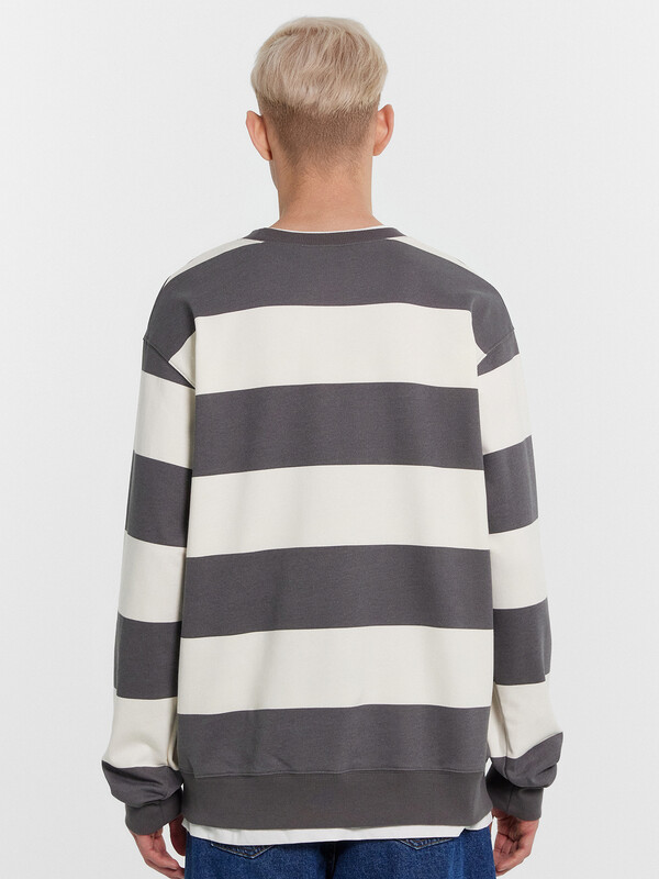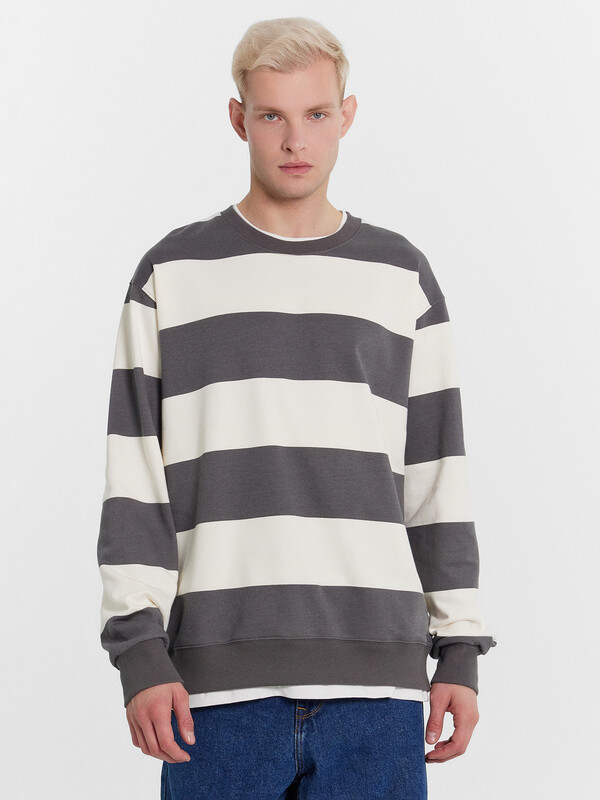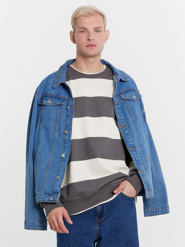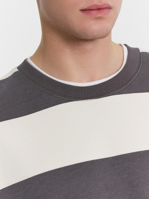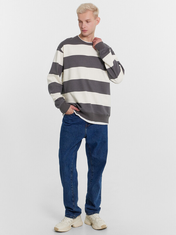 Джемпер прямого силуэта из трикотажного футера с теплым подчесом. Круглый вырез горловины окантован декоративной деталью из кулирки, как и нижний край – словно под джемпер поддета футболка. Рукава длинные, с манжетами. Стильный повседневный вариант