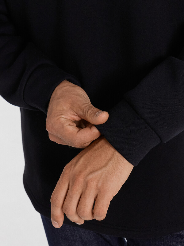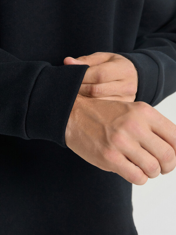 Рукава втачные длинные. Линия плача слегка спущена. По низу рукавов отрезные манжеты из основного полотна. По переду накладной карман кенгуру (ПО ЗАДАНИЮ)