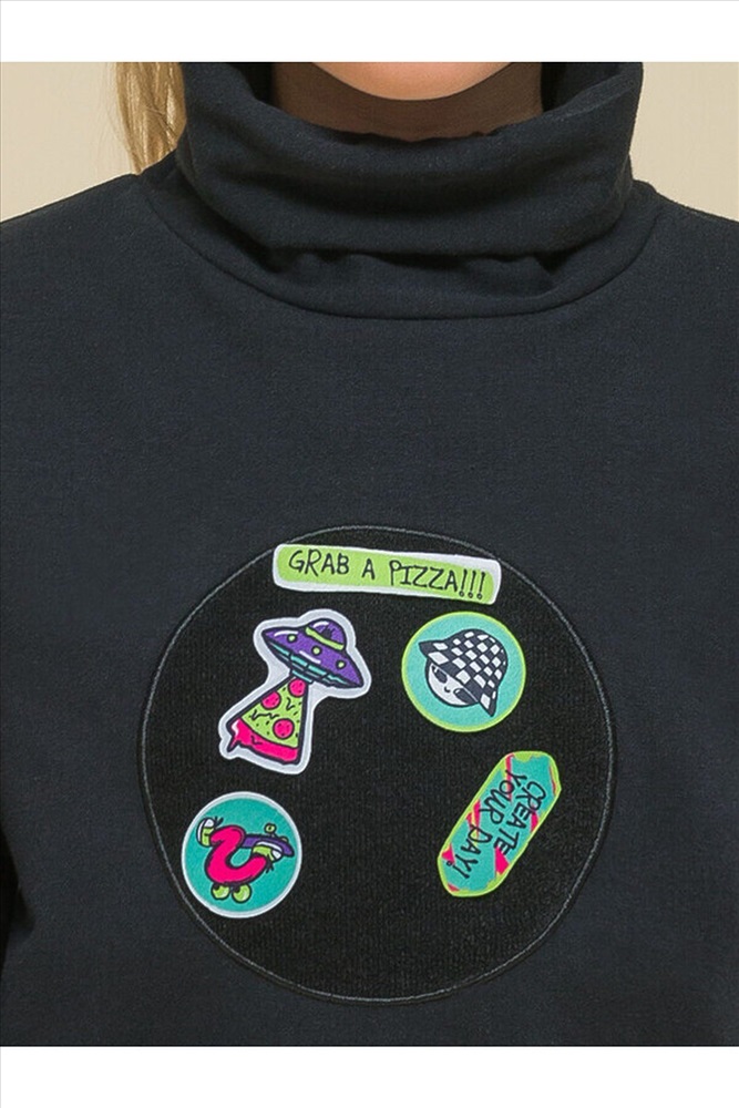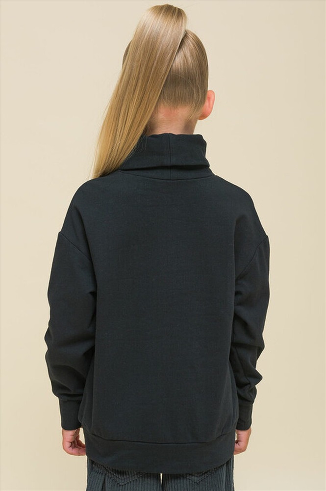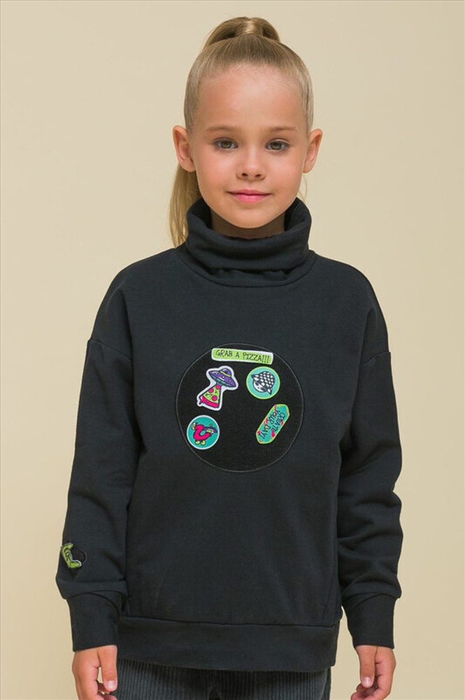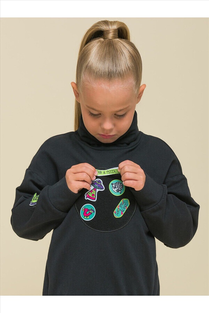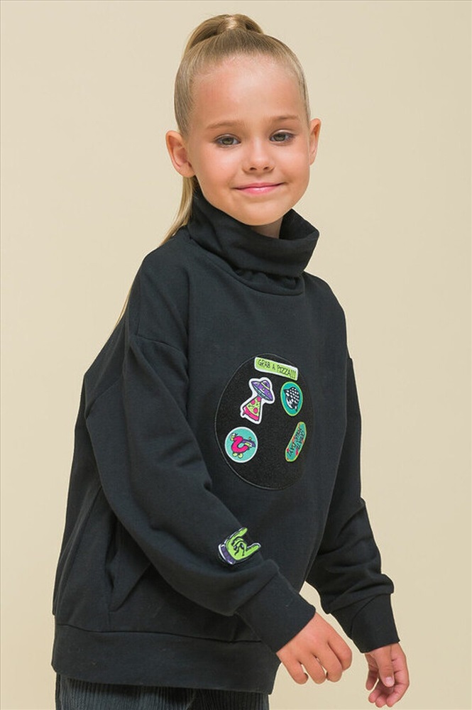 Детский свитшот для девочки. Лонгслив модного оверсайз-силуэта со спущенным плечом подарит ребёнку комфорт и свободу движений. Джемпер с воротником- стойкой. Его можно носить двумя способами: в два сложения — как у классической водолазки — и без отворота — актуально, стильно. По переду оригинальные рельефы, в которых прячутся карманы. По низу изделия и на рукавах манжеты из основной ткани. На манжетах рукавов отверстия для большого пальца — можно носить как митенки или как обычные манжеты. Модель неприхотлива в уходе. В составе ткани (футер с начёсом) преобладает качественный хлопок — джемпер мягкий и отлично пропускает воздух, давая коже ребёнка дышать. Эластан помогает изделию сохранить прекрасную форму надолго. Свитшот с оригинальным декором — «собери принт». Патчи на велкро (липучке) можно складывать в аппликации по своему желанию — такая необычная возможность творчества порадует ребёнка! В наборе несколько рисунков и надписей, надписи переводятся: «создай свой день!», «хватай пиццу!» Оверсайз-свитшот выполнен в классическом чёрном цвете, его легко сочетать с любыми брюками, джинсами, легинсами. Размерный ряд: 1 (86): 2 (92): 3 (98): 4 (104): 5 (110): 6 (116). Свитшот с надписью станет отличным дополнением гардероба для маленьких девочек дошкольного возраста. Его можно носить в детский сад, на прогулки, отдых, а также дома. Такие джемперы подходят для круглогодичного применения: летом, осенью, зимой, весной и демисезон. Отличный подарок дочери, внучке или сестре на Новый год и любой другой праздник.