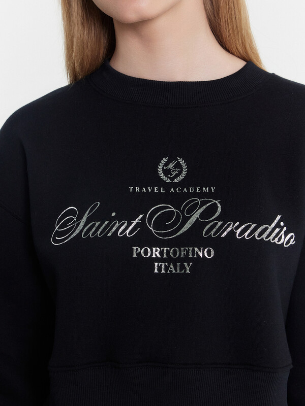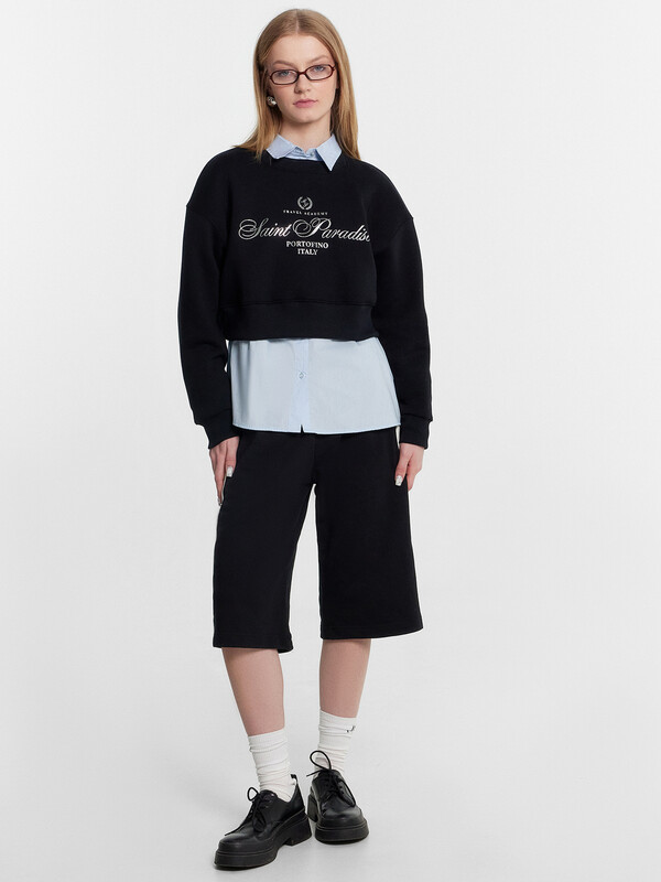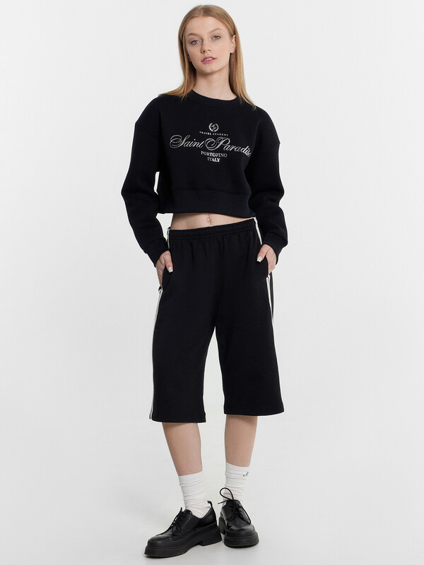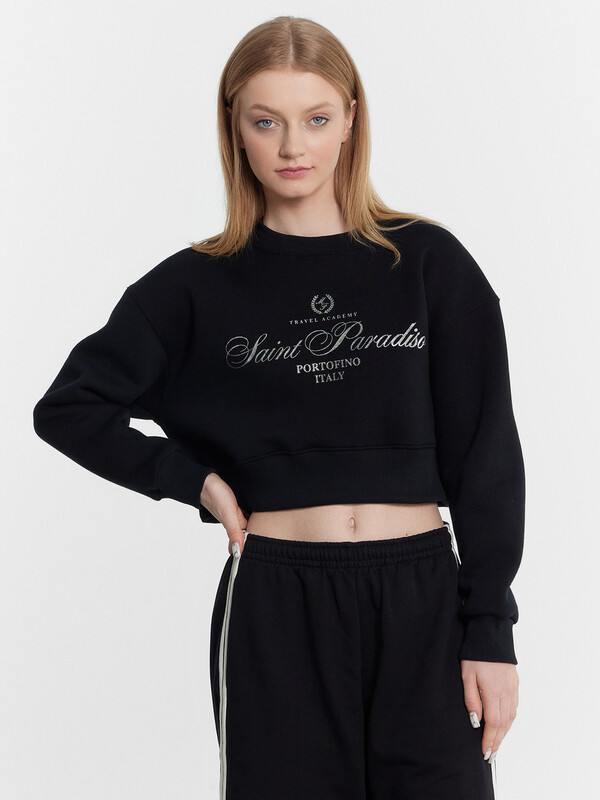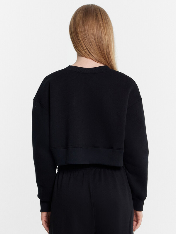Свитшот изготовлен из трикотажного полотна футер 3х нитка без подчеса. Свитшот свободный, укороченный. Горловина обработана обтачкой из рибаны. Рукава втачные длинные с отрезными манжетами из рибаны. По низу свитшота отрезной пояс из рибаны.