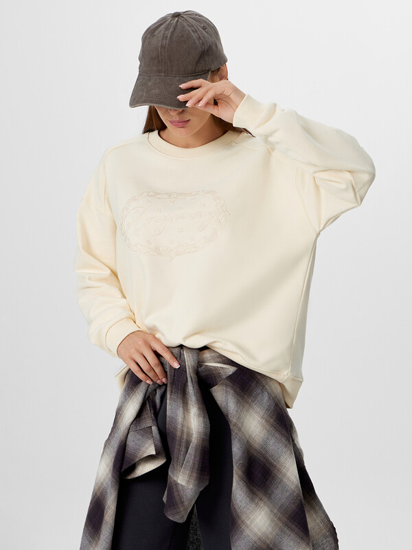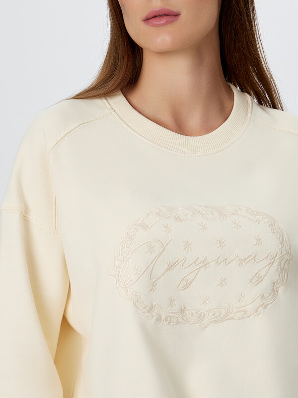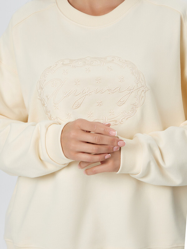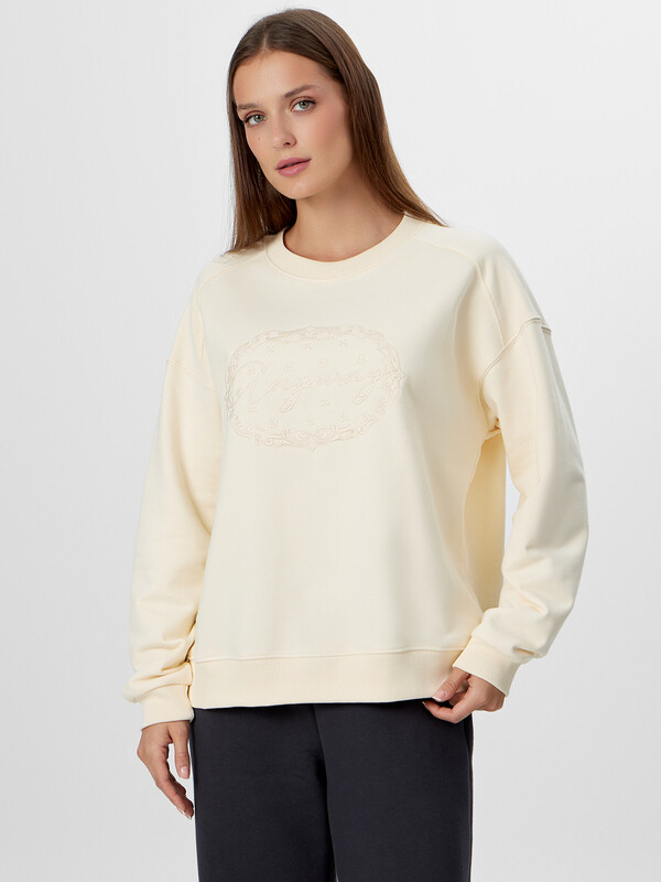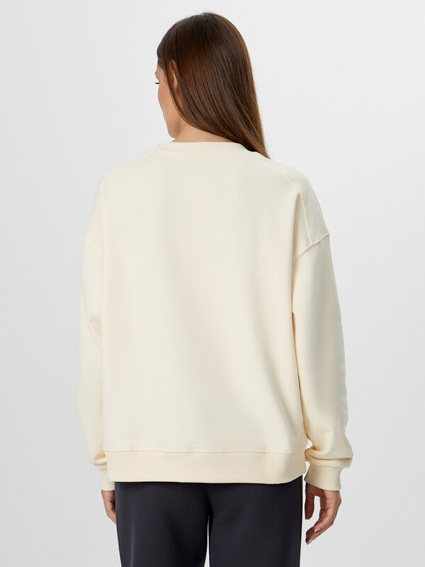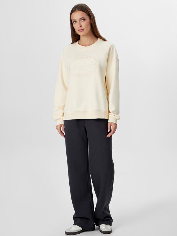 Свитшот свободного силуэта. Горловина круглой формы с обтачкой из рибаны. Рукава втачные, длинные. Плечо спущено, пройма углублена. По низу рукава отрезная манжета из рибаны. По плечу отрезная декоративная деталь. По низу свитшота отрезной пояс из рибаны. Шов втачивания обтачки, рукава, плечевые, шов притачивания пояса распошиты.