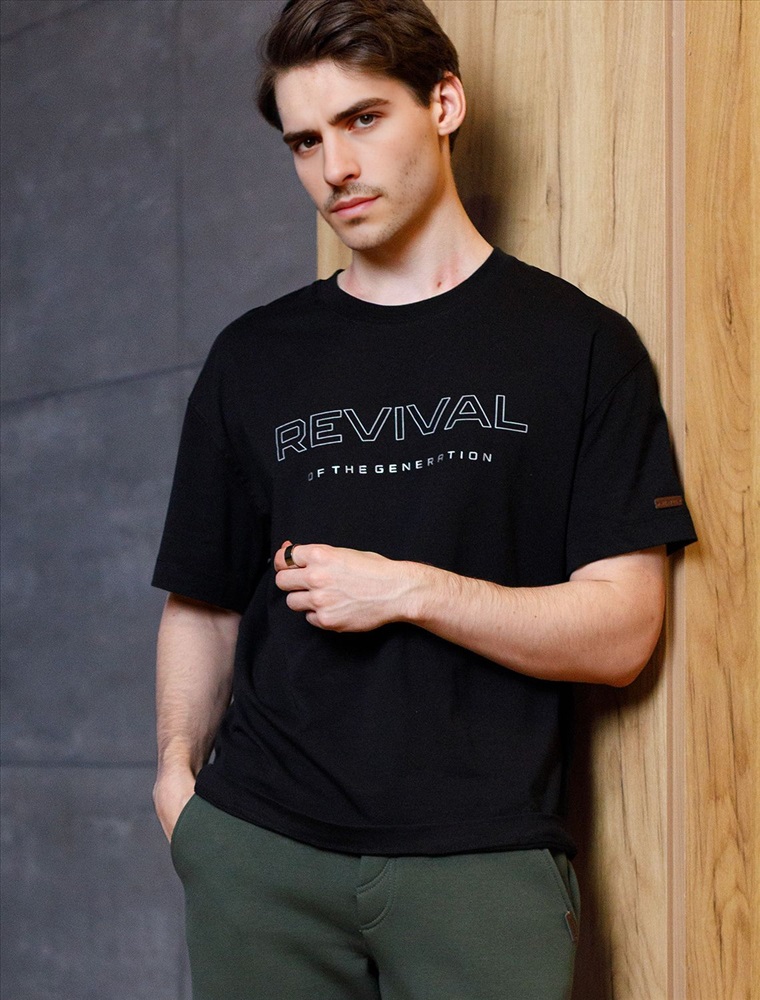 Перевод принта: Revival of the generation - возрождение поколения. Футболка свободного кроя выполнена из премиального хлопка. Авторский принт нанесен красками с устойчивым покрытием. Благодаря эластану, носить изделие очень комфортно, и оно сохранит свой безупречный вид в течение долгого времени. На рукаве нашивка из эко-кожи с логотипом бренда.
