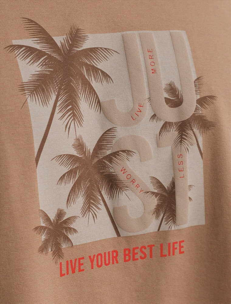 Перевод принта: Live your best live - живи свою лучшую жизнь. Футболка свободного кроя выполнена из премиального хлопка. Авторский принт нанесен красками с устойчивым покрытием. Благодаря эластану, носить изделие очень комфортно, и оно сохранит свой безупречный вид в течение долгого времени. На рукаве нашивка из эко-кожи с логотипом бренда.