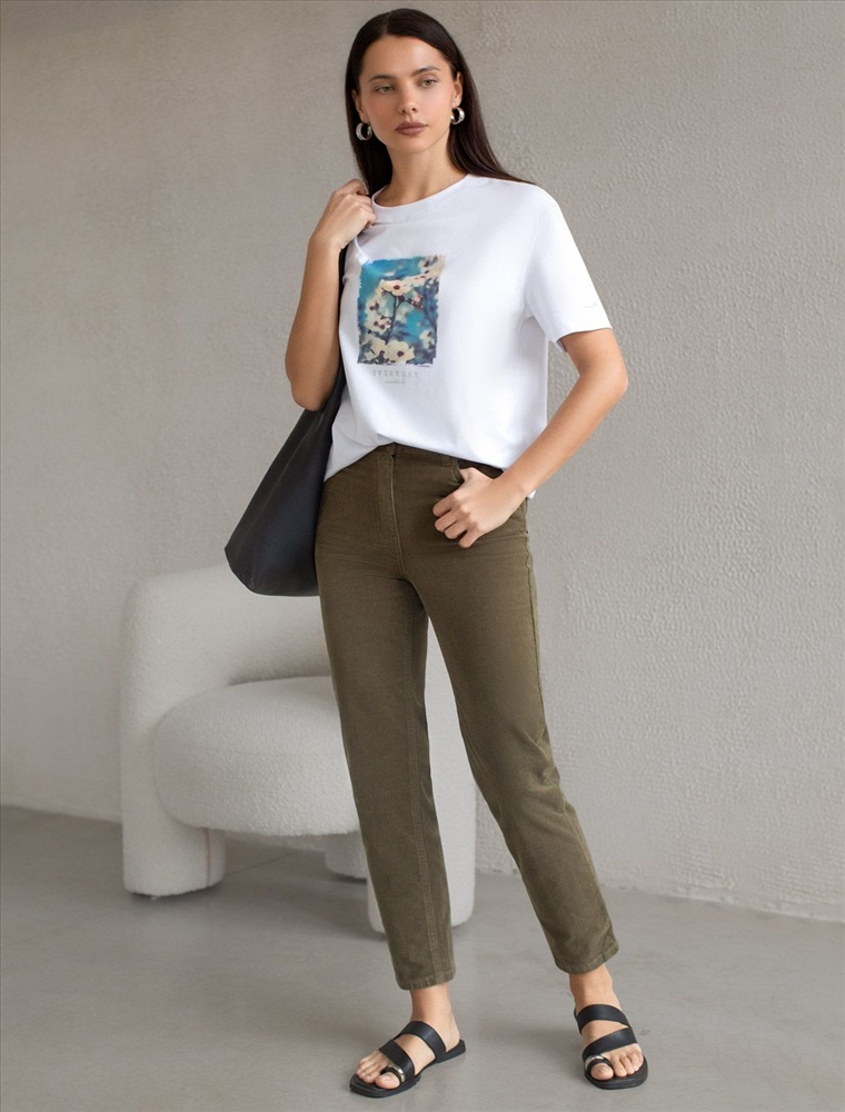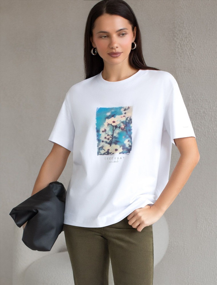 Модная футболка белого цвета привлекает внимание своим интересным дизайном и ярким принтом. Благодаря прямому крою изделие комфортно садится на любую фигуру, в том числе на большие размеры, и не сковывает движений. Круглый вырез подчеркивает современный стиль, а натуральный материал из хлопка с добавлением эластана обеспечивает удобство в повседневной носке и приятные тактильные ощущения. Прочность и износостойкая структура позволяют сохранять свежий внешний вид после множества стирок. Принт в виде цветов и надписи нанесен красками с устойчивым покрытием, перевод надписи: Everyday essentials - Повседневные вещи, которые необходимы. Стильная футболка гармонично вписывается в любой гардероб и подойдет для прогулок, отдыха или неформальных встреч. Благодаря особенностям кроя модель хорошо сидит, скрывая недостатки и подчеркивая достоинства. Яркая футболка идеально сочетается с базовыми вещами, позволяя создавать новые интересные образы каждый день.