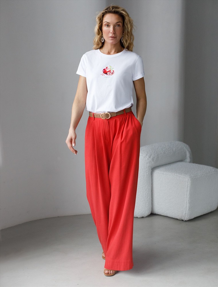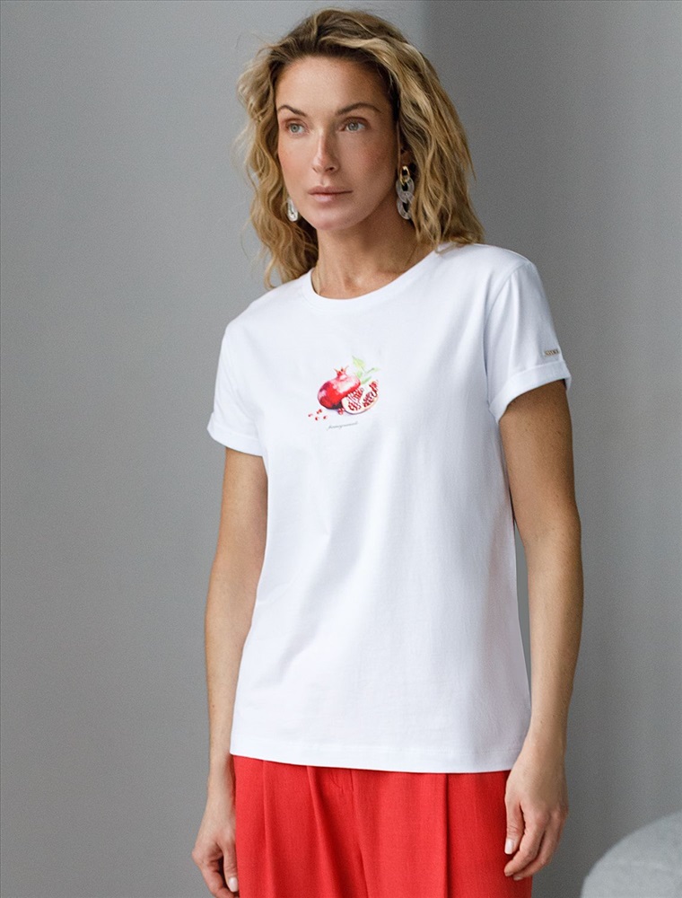 Модная футболка белого цвета привлекает внимание своим интересным дизайном и ярким принтом. Благодаря прямому крою изделие комфортно садится на любую фигуру, в том числе на большие размеры, и не сковывает движений. Круглый вырез подчеркивает современный стиль, а натуральный материал из хлопка с добавлением эластана обеспечивает удобство в повседневной носке и приятные тактильные ощущения. Прочность и износостойкая структура сохраняет первоначальную форму футболки после множества стирок. Рукава имеют аккуратные подгибы, что придает изделию завершенность и помогает сохранять аккуратный внешний вид. Принт в виде фрукта гранат нанесен красками с устойчивым покрытием. Стильная футболка гармонично вписывается в любой гардероб и подойдет для прогулок, отдыха дома или неформальных встреч. Благодаря особенностям кроя модель хорошо сидит, скрывая недостатки и подчеркивая достоинства. Удобная футболка идеально сочетается с базовыми вещами, позволяя создавать новые интересные образы каждый день.