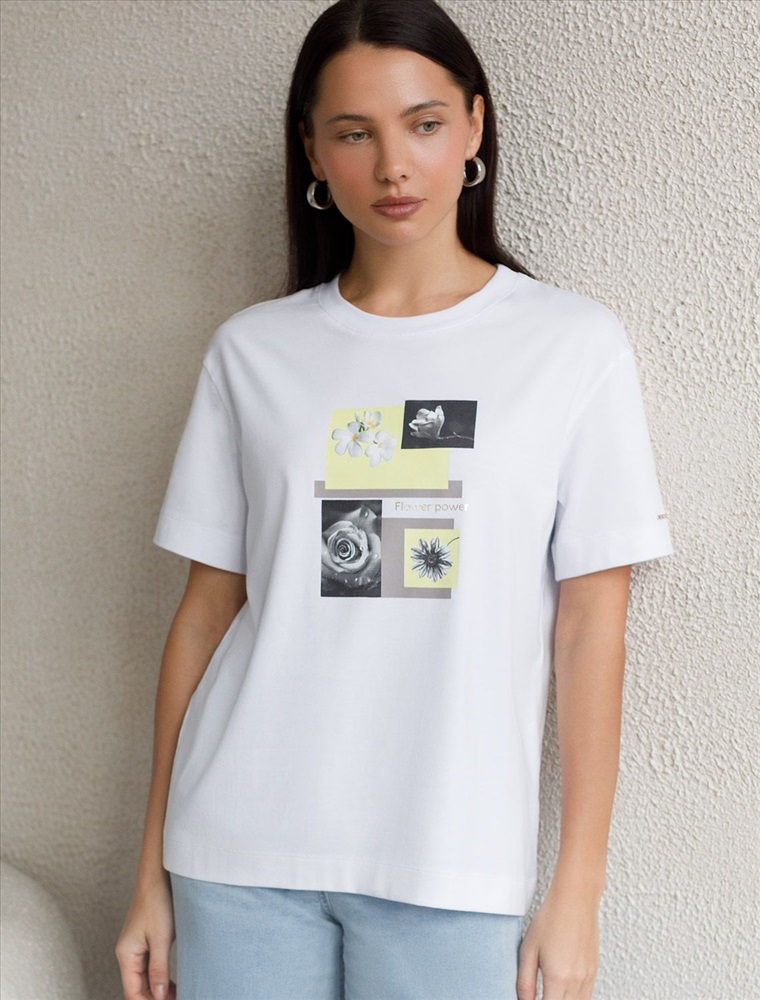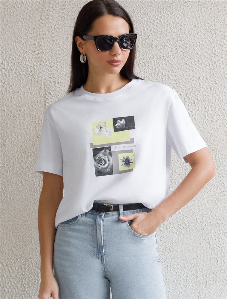 Модная футболка белого цвета привлекает внимание своим интересным дизайном и ярким принтом. Благодаря прямому крою изделие комфортно садится на любую фигуру, в том числе на большие размеры, и не сковывает движений. Круглый вырез подчеркивает современный стиль, а натуральный материал из хлопка с добавлением эластана обеспечивает удобство в повседневной носке и приятные тактильные ощущения. Прочность и износостойкая структура позволяют сохранять свежий внешний вид после множества стирок. Принт в виде цветов и надписи нанесен красками с устойчивым покрытием, перевод надписи: Flower power - Цветочная сила. Стильная футболка гармонично вписывается в любой гардероб и подойдет для прогулок, отдыха или неформальных встреч. Благодаря особенностям кроя модель хорошо сидит, скрывая недостатки и подчеркивая достоинства. Яркая футболка идеально сочетается с базовыми вещами, позволяя создавать новые интересные образы каждый день.
