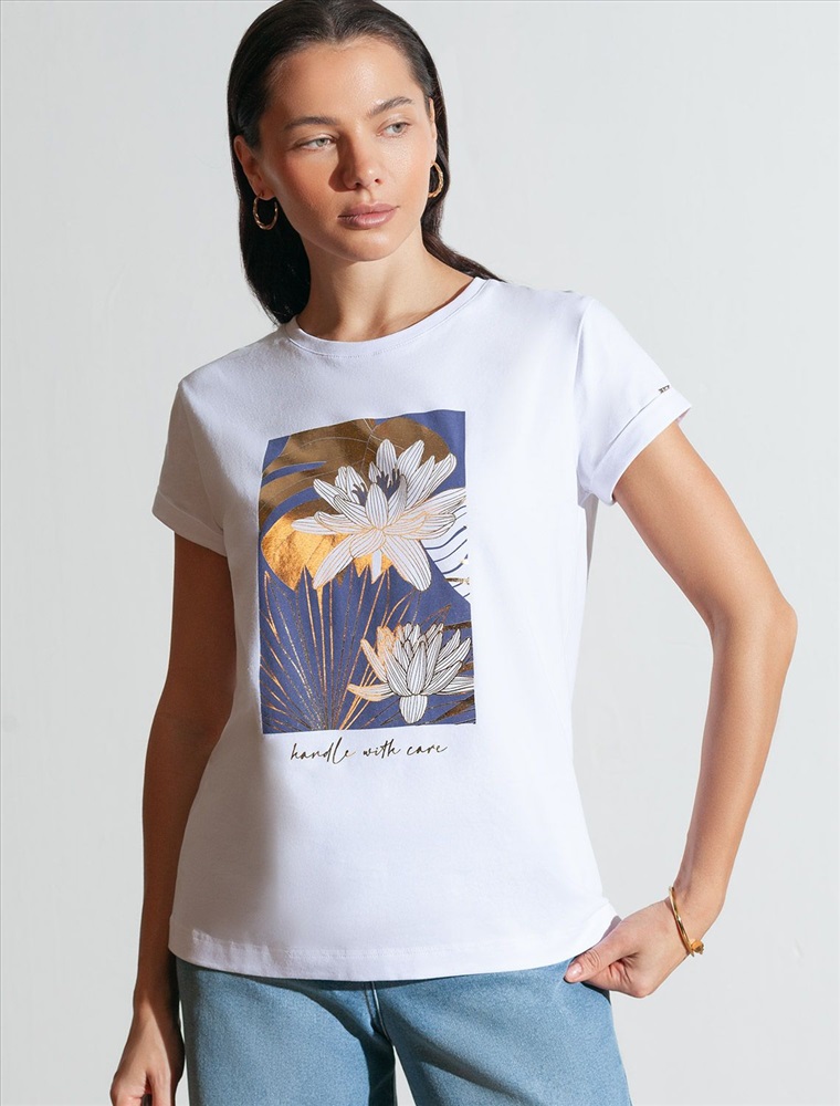 Состав: 92%Хлопок 8%ПУ; Плотность: 170 Г/м2 Модная футболка белого цвета привлекает внимание своим интересным дизайном и ярким принтом. Благодаря прямому крою изделие комфортно садится на любую фигуру, в том числе на большие размеры, и не сковывает движений. Круглый вырез подчеркивает современный стиль, а натуральный материал из хлопка с добавлением эластана обеспечивает удобство в повседневной носке и приятные тактильные ощущения. Прочность и износостойкая структура сохраняет первоначальную форму футболки после множества стирок. Рукава имеют аккуратные подгибы, что придает изделию завершенность и помогает сохранять аккуратный внешний вид. Принт в виде цветов и надписи нанесен красками с устойчивым покрытием, перевод надписи: Handle with care - Обращаться с осторожностью. Стильная футболка гармонично вписывается в любой гардероб и подойдет для прогулок, отдыха дома или неформальных встреч. Благодаря особенностям кроя модель хорошо сидит, скрывая недостатки и подчеркивая достоинства. Удобная футболка идеально сочетается с базовыми вещами, позволяя создавать новые интересные образы каждый день.