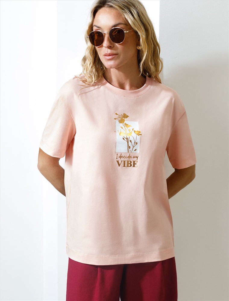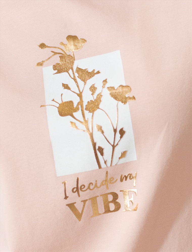 Модная футболка пудрового цвета привлекает внимание своим интересным дизайном и ярким принтом. Благодаря прямому крою изделие комфортно садится на любую фигуру, в том числе на большие размеры, и не сковывает движений. Круглый вырез подчеркивает современный стиль, а натуральный материал плотностью 170 Г/м2 из хлопка с добавлением эластана обеспечивает удобство в повседневной носке и приятные тактильные ощущения. Прочность и износостойкая структура позволяют сохранять свежий внешний вид после множества стирок. Принт в виде цветов и надписи нанесен красками с устойчивым покрытием, перевод надписи: I decide my vibe - Я определяю свое настроение.Стильная футболка гармонично вписывается в любой гардероб и подойдет для прогулок, отдыха или неформальных встреч. Благодаря особенностям кроя модель хорошо сидит, скрывая недостатки и подчеркивая достоинства. Яркая футболка идеально сочетается с базовыми вещами, позволяя создавать новые интересные образы каждый день.