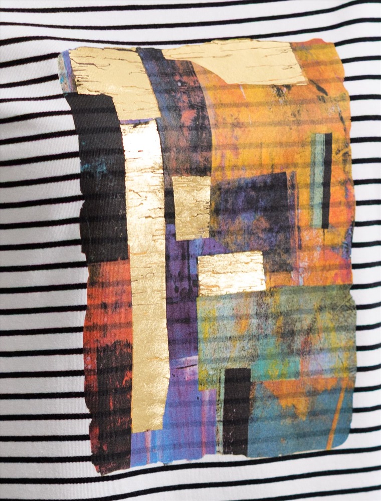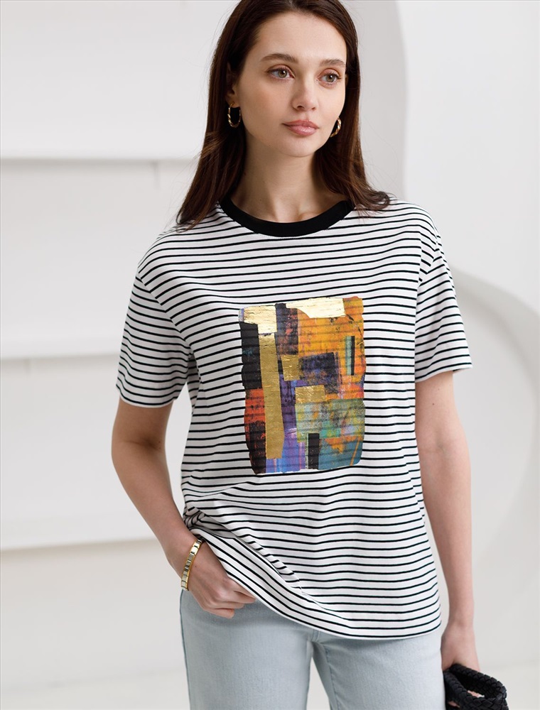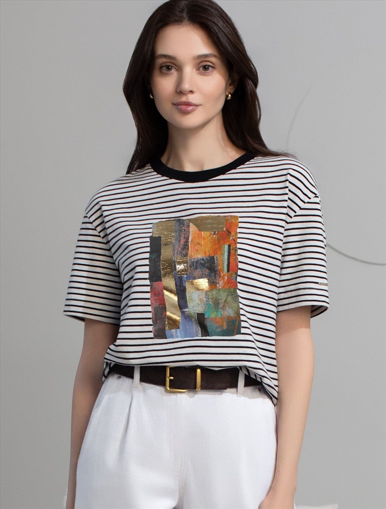 Модная футболка белого цвета в черную тонкую горизонтальную полоску привлекает внимание своим интересным дизайном и ярким принтом. Благодаря прямому крою изделие комфортно садится на любую фигуру, в том числе на большие размеры, и не сковывает движений. Круглый вырез подчеркивает современный стиль, а натуральный материал плотностью 170 Г/м2 из хлопка с добавлением эластана обеспечивает удобство в повседневной носке и приятные тактильные ощущения. Прочность и износостойкая структура позволяют сохранять свежий внешний вид после множества стирок. Принт в виде яркой абстракции нанесен красками с устойчивым покрытием. Стильная футболка гармонично вписывается в любой гардероб и подойдет для прогулок, отдыха или неформальных встреч. Благодаря особенностям кроя модель хорошо сидит, скрывая недостатки и подчеркивая достоинства. Яркая футболка идеально сочетается с базовыми вещами, позволяя создавать новые интересные образы каждый день.