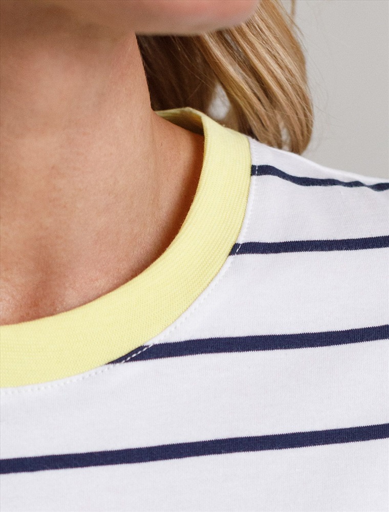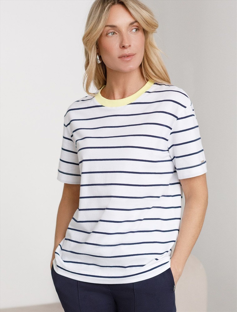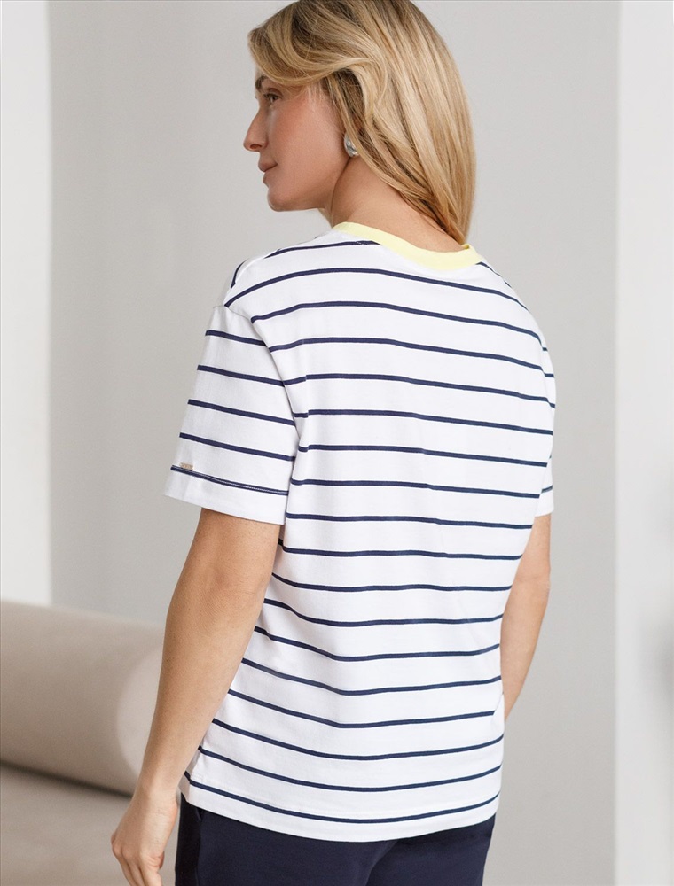 Свободная футболка белого цвета в темно-синюю полоску из премиального хлопка плотностью 170 Г/м2 станет универсальным решением для создания стильного и комфортного образа. Футболка прямого кроя идеально садится на любую фигуру, обеспечивая свободу движений. Дышащая ткань из натурального хлопка делает изделие легким и приятным к телу, что особенно важно в теплое время года, отлично пропускает воздух и не вызывает дискомфорта при длительном ношении. Модная футболка в полоску добавляет яркости образу, сохраняя баланс между минимализмом и выразительностью.