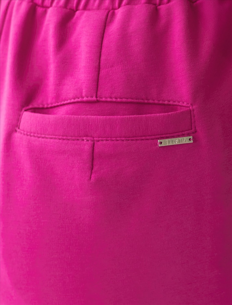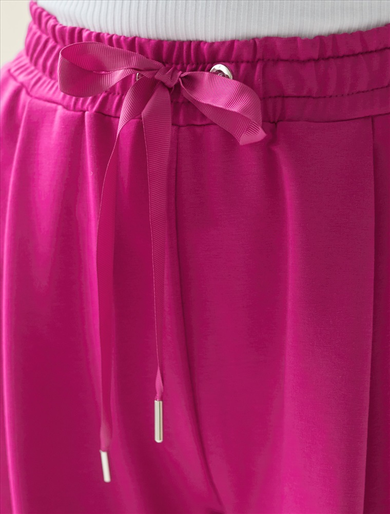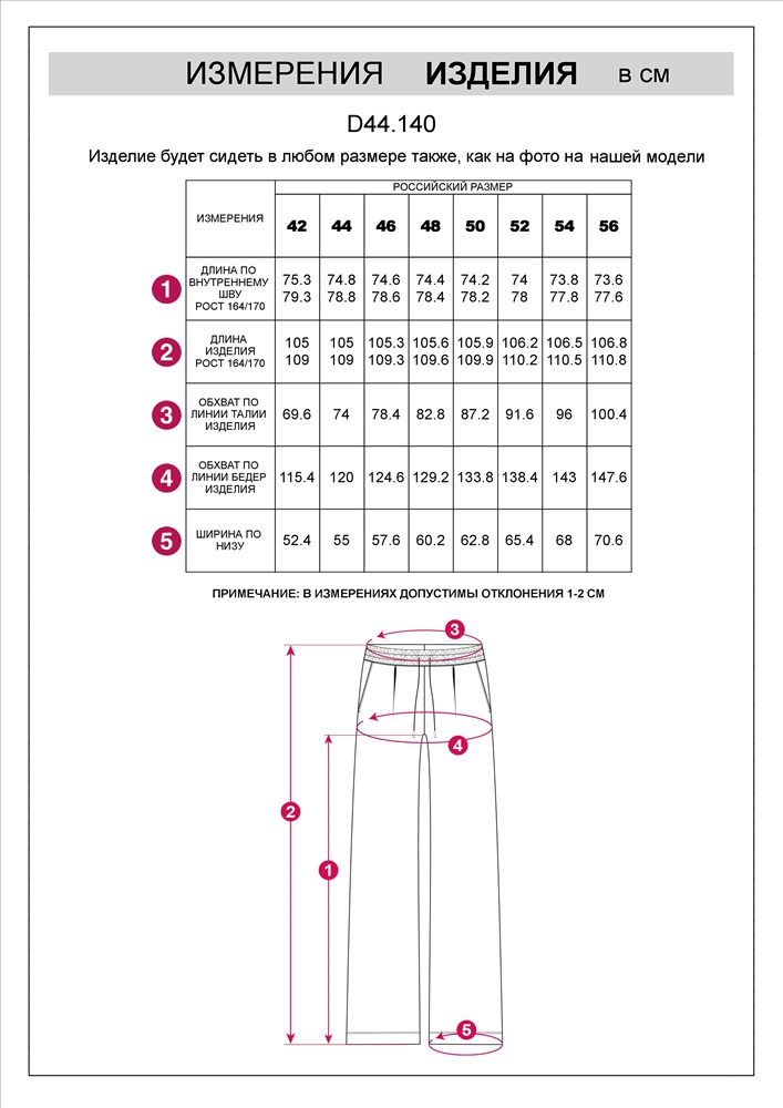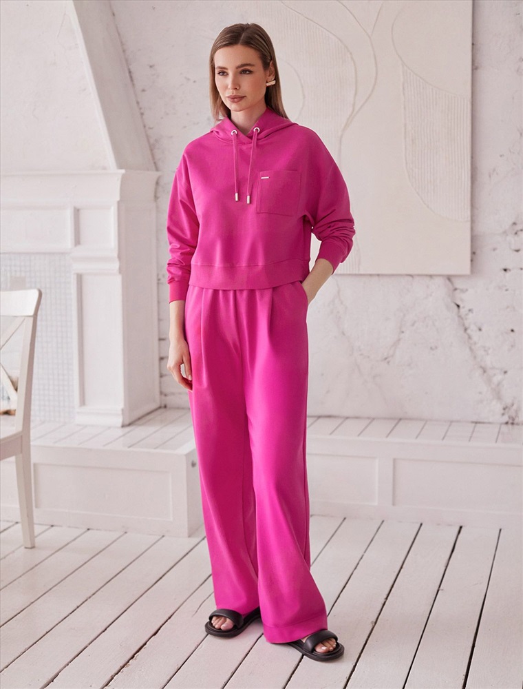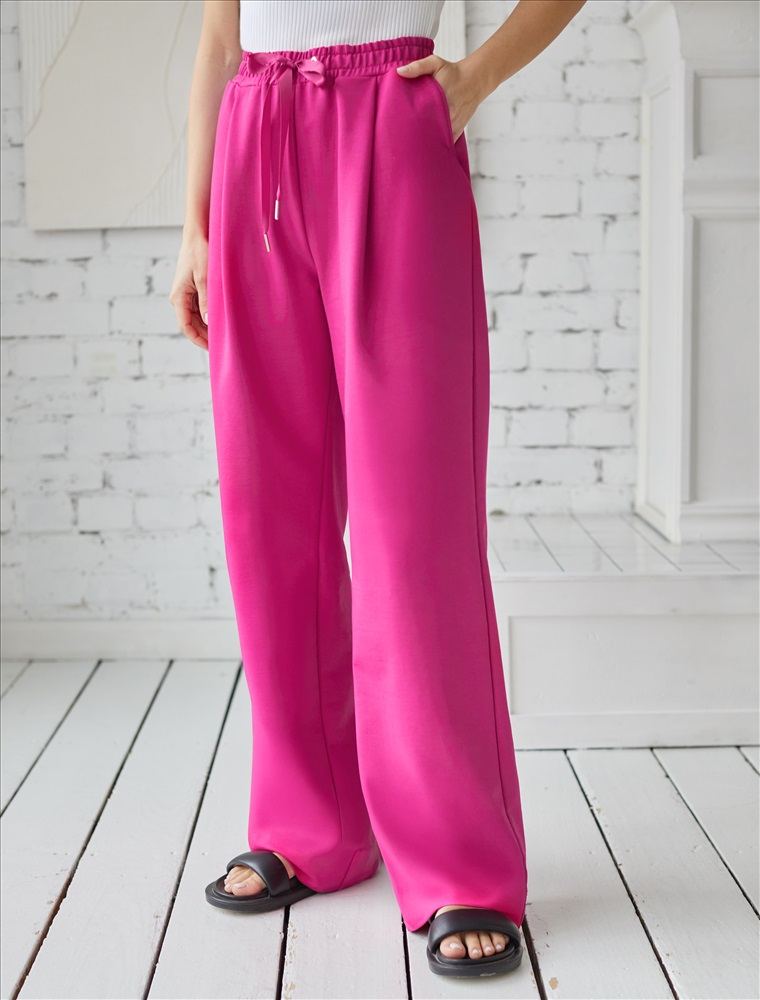 Брюки свободного кроя выполнены из эластичного футера-двухнитки. Модель дополнена защипами и боковыми карманами как у классических брюк и одним задним карманом. Эластичный пояс на резинке с шнурком из репсовой ленты и металлической фурнитурой. Брюки сочетаются в костюме с футболкой D49.085