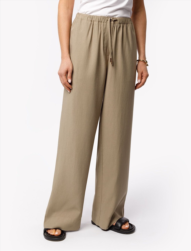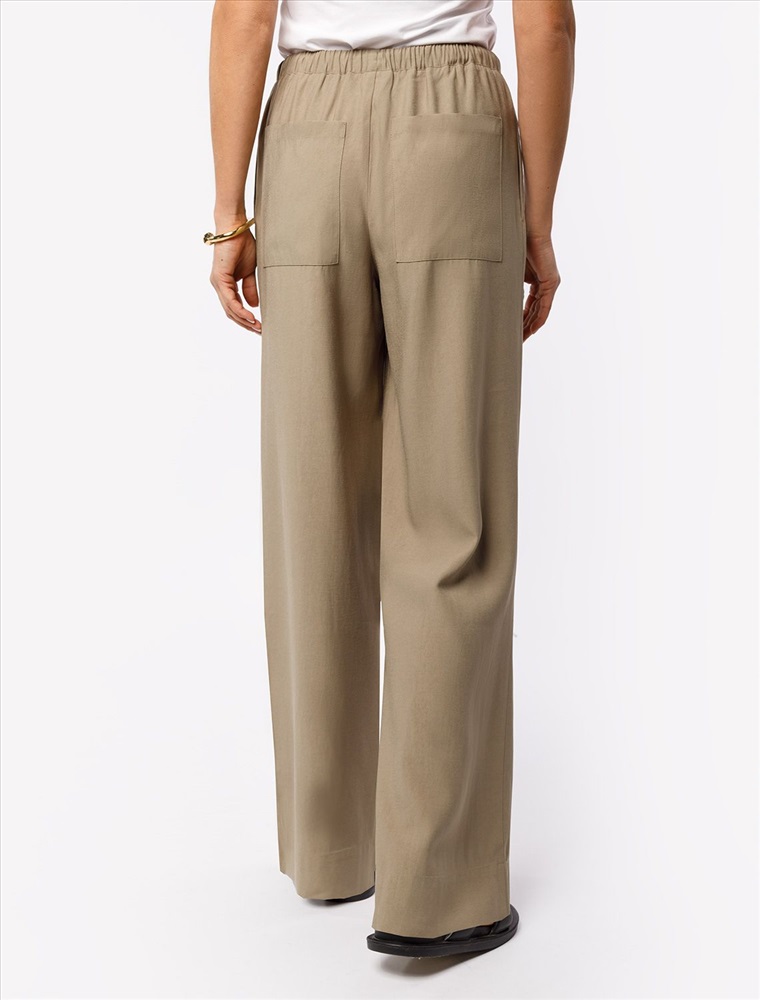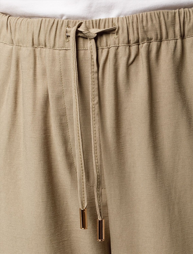 Брюки свободного кроя выполнены из плотного лиоцелла. Модель дополнена карманами и поясом с эластичной резинкой и регулируемым шнурком с золотистой фурнитурой. Ткань изделия отлично держит форму, плавно драпируется и не просвечивает. В теплое время года приятно охлаждает кожу. Добавление синтетических волокон в составе изделия, предотвращает сминаемостьи поддерживает формоустойчивость. Брюки сочетаются в костюме с топом D23.063, блузкой D29.266, D29.267 и жилетом D27.002