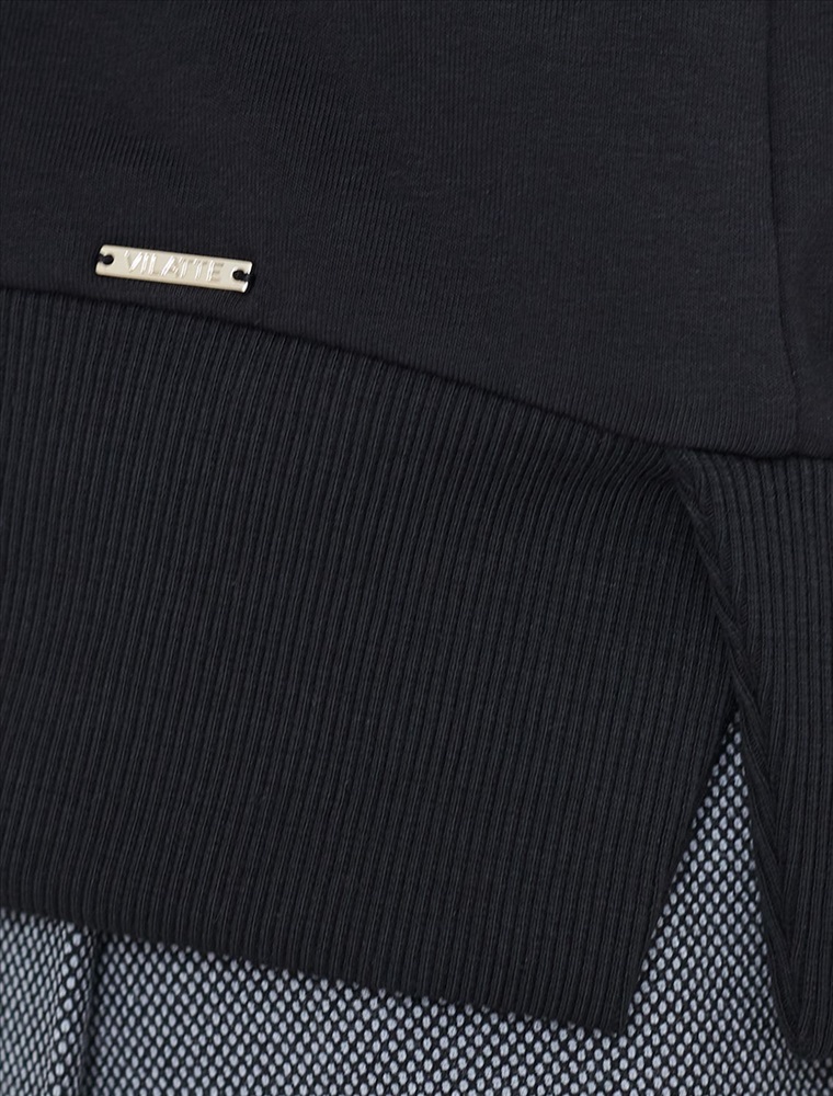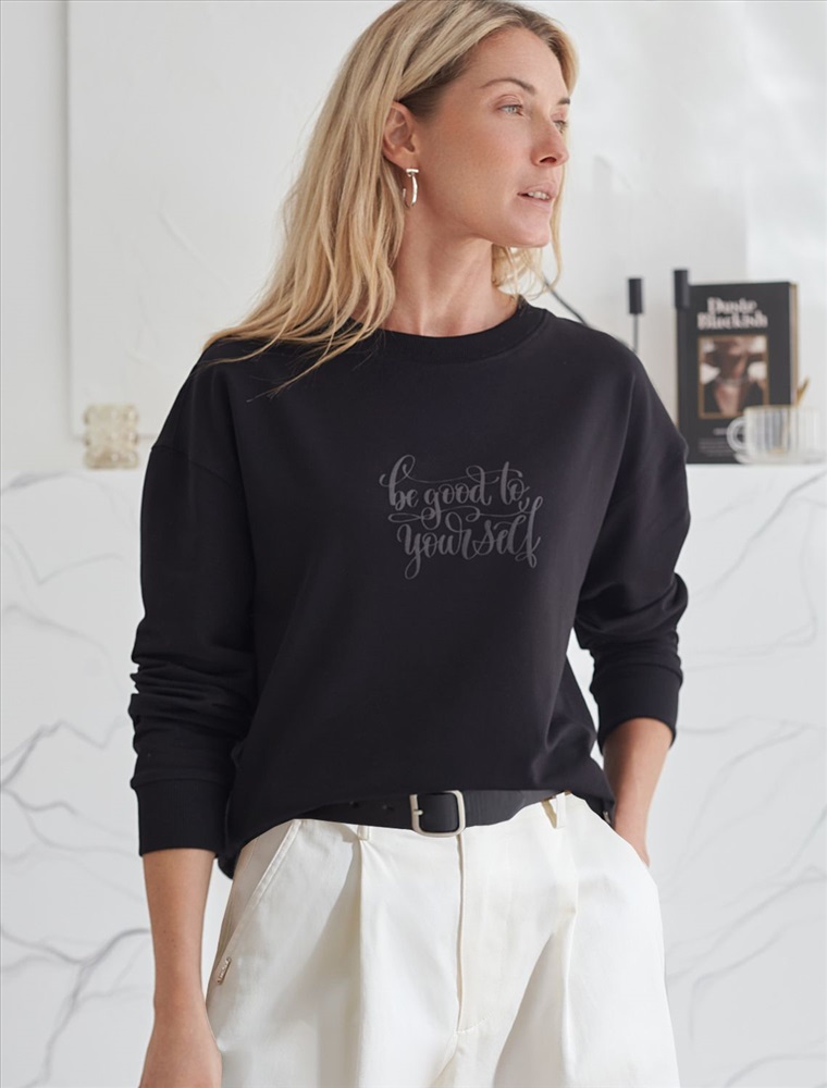 Стильный свитшот черного цвета из премиального футера двухнитки с эластаном сочетает в себе комфорт и оригинальность. Джемпер выполнен из натурального хлопка, который обеспечивает мягкость и дышащие свойства ткани. Нежный материал дарит ощущение уюта в любое время года, а премиальное качество изготовления гарантирует долговечность и сохранение формы после множества стирок. Особенность изделия — спущенная линия плеча и аккуратные разрезы, которые добавляют современный акцент и делают образ более выразительным. Принт в виде надписи придает индивидуальность, позволяя выделиться без лишней вычурности. Перевод надписи Be good Be yourself - Будь хорошей, будь собой. Дополнен металлическим логотипом бренда.