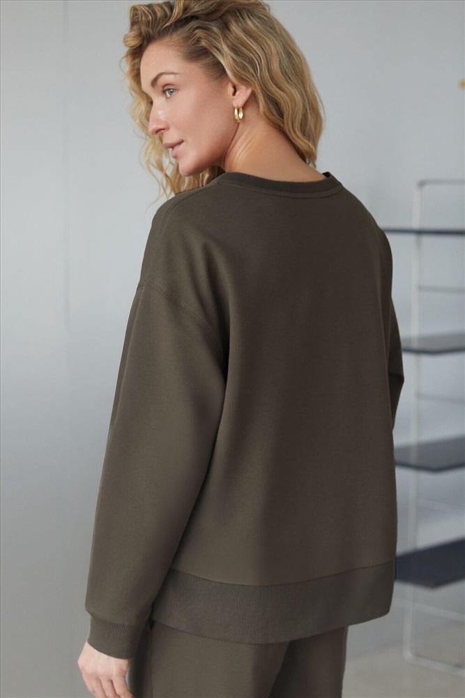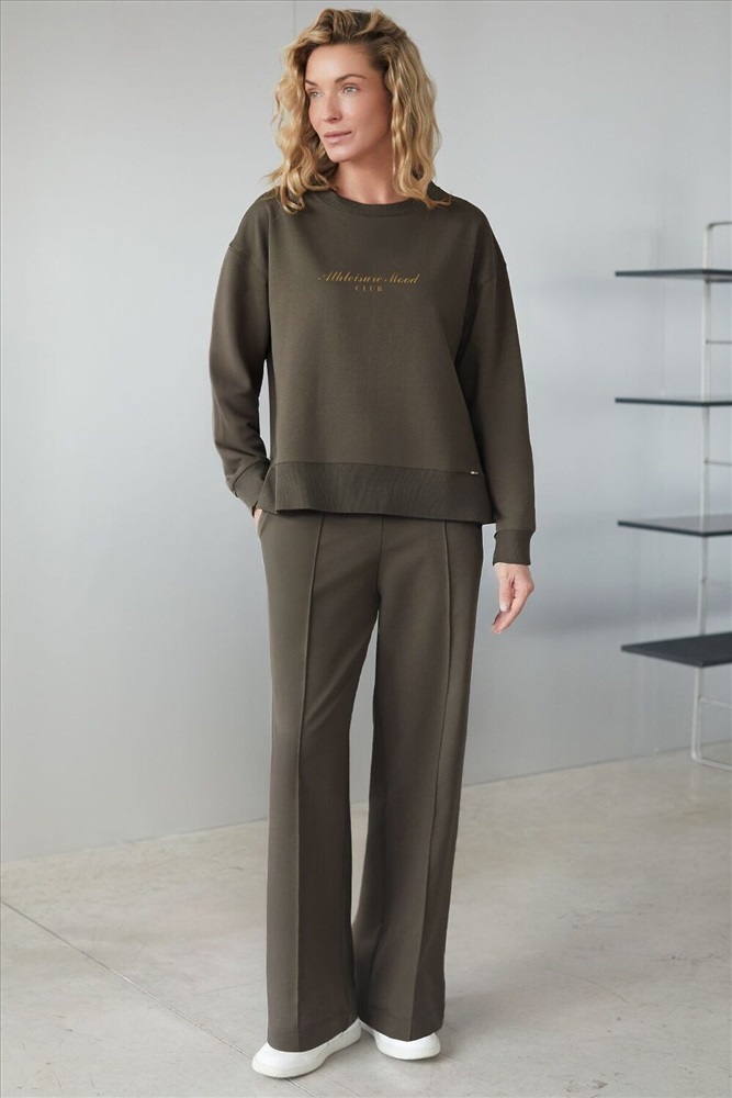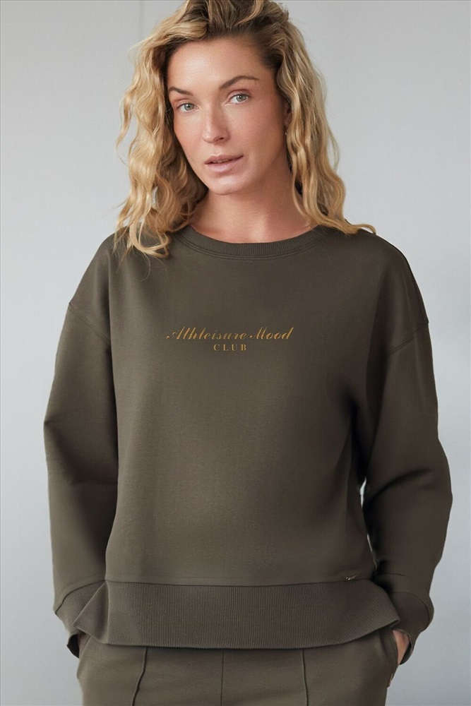 Стильный свитшот цвета хаки из премиального футера двухнитки с эластаном сочетает в себе комфорт и оригинальность. Джемпер выполнен из натурального хлопка, который обеспечивает мягкость и дышащие свойства ткани. Нежный материал дарит ощущение уюта в любое время года, а премиальное качество изготовления гарантирует долговечность и сохранение формы после множества стирок. Особенность изделия — спущенная линия плеча и аккуратные разрезы, которые добавляют современный акцент и делают образ более выразительным. Принт в виде надписи придает индивидуальность, позволяя выделиться без лишней вычурности. Перевод надписи Athleisure mood club - Клуб спортивного настроения. Дополнен металлическим логотипом бренда. Представлена широкая размерная линейка, включая маленькие и большие размеры, что позволяет подобрать идеальный вариант для разной фигуры и роста. Этот уютный свитшот отлично подходит для повседневной носки благодаря своей комфортной посадке и мягкой текстуре. Он станет универсальным элементом гардероба, легко сочетающимся с различными стилями одежды. Свободный джемпер из футера станет отличным выбором для активного отдыха, обеспечивая стильный внешний вид и удобство весной, летом или в прохладную погоду. Рекомендуем сочетать с артикулами: D44.135, D44.166