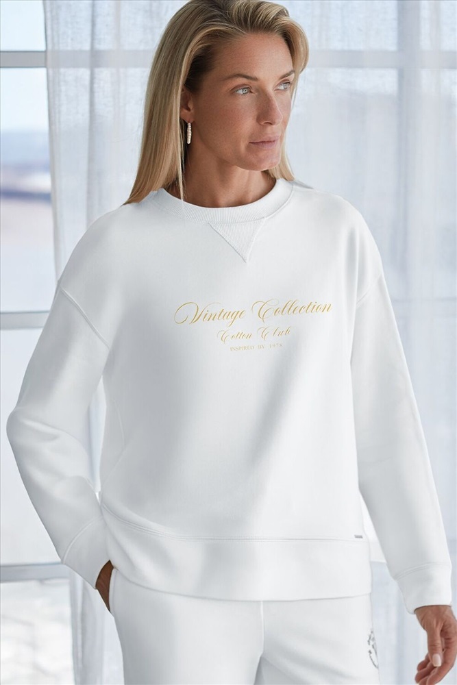 ID товара: 1228147 Состав: 95%Хлопок 5%ПУ Сезон: Демисезон Рукав: Длинный Страна бренда: Россия Страна производства: Китай Стильный свитшот белого цвета из премиального футера двухнитки с эластаном сочетает в себе комфорт и оригинальность. Джемпер выполнен из натурального хлопка, который обеспечивает мягкость и дышащие свойства ткани. Нежный материал дарит ощущение уюта в любое время года, а премиальное качество изготовления гарантирует долговечность и сохранение формы после множества стирок. Особенность изделия — спущенная линия плеча и аккуратные разрезы, которые добавляют современный акцент и делают образ более выразительным. Принт в виде надписи придает индивидуальность, позволяя выделиться без лишней вычурности. Перевод надписи Vintage collection Cotton club Inspired by 1978 - Винтажная коллекция Cotton Club, вдохновленная 1978 годом. Дополнен металлическим логотипом бренда. Представлена широкая размерная линейка, включая маленькие и большие размеры, что позволяет подобрать идеальный вариант для разной фигуры и роста. Этот уютный свитшот отлично подходит для повседневной носки благодаря своей комфортной посадке и мягкой текстуре. Он станет универсальным элементом гардероба, легко сочетающимся с различными стилями одежды. Свободный джемпер из футера станет отличным выбором для активного отдыха, обеспечивая стильный внешний вид и удобство весной, летом и любое другое время года. Рекомендуем сочетать с артикулами: D44.166, D44.135 Комментарии к товару