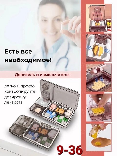 Таблетница с делителем и измельчителем представляет собой компактную коробочку для хранения лекарств, витаминов и биологически активных добавок. Один из главных преимуществ этой таблетницы — возможность делить таблетку пополам с помощью специального делителя. Это особенно удобно для людей, которым требуется точное дозирование лекарств. Кроме того, наличие измельчителя позволит легко измельчить таблетку в порошок, что может быть полезным в случае трудности глотания целых таблеток. Эта коробка подходит для хранения как крупных капсул, так и маленьких таблеток. У неё есть понятный контейнер с разделениями, где можно хранить различные виды медикаментов или витаминов. Таблетница с данными характеристиками станет надежным спутником как дома, так и в поездке. Её компактная конструкция делает возможным брать её с собой в дорогу или на работу без лишнего занимаемого места.