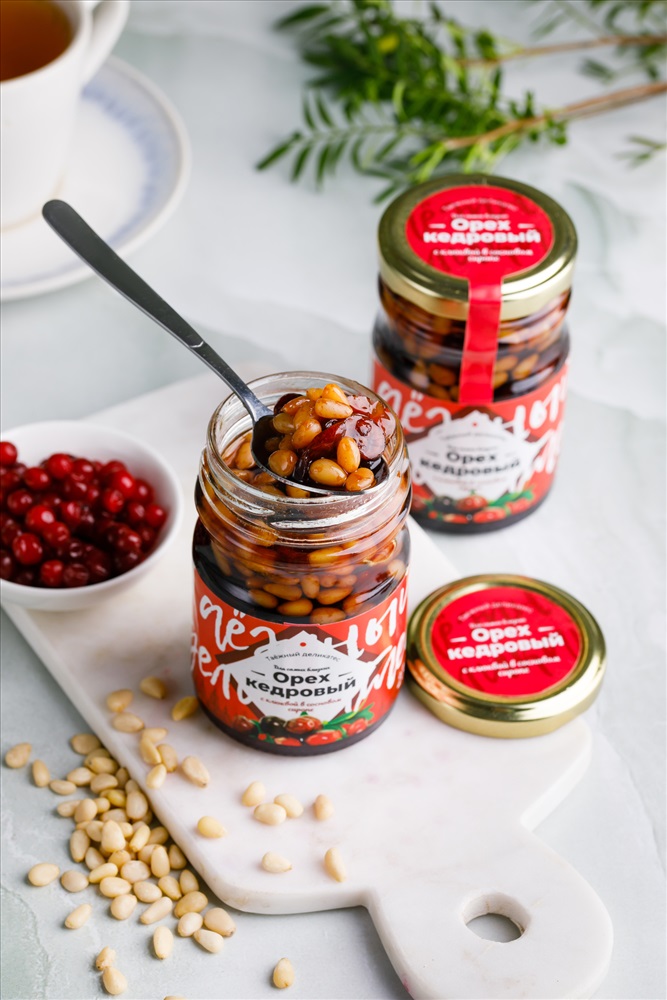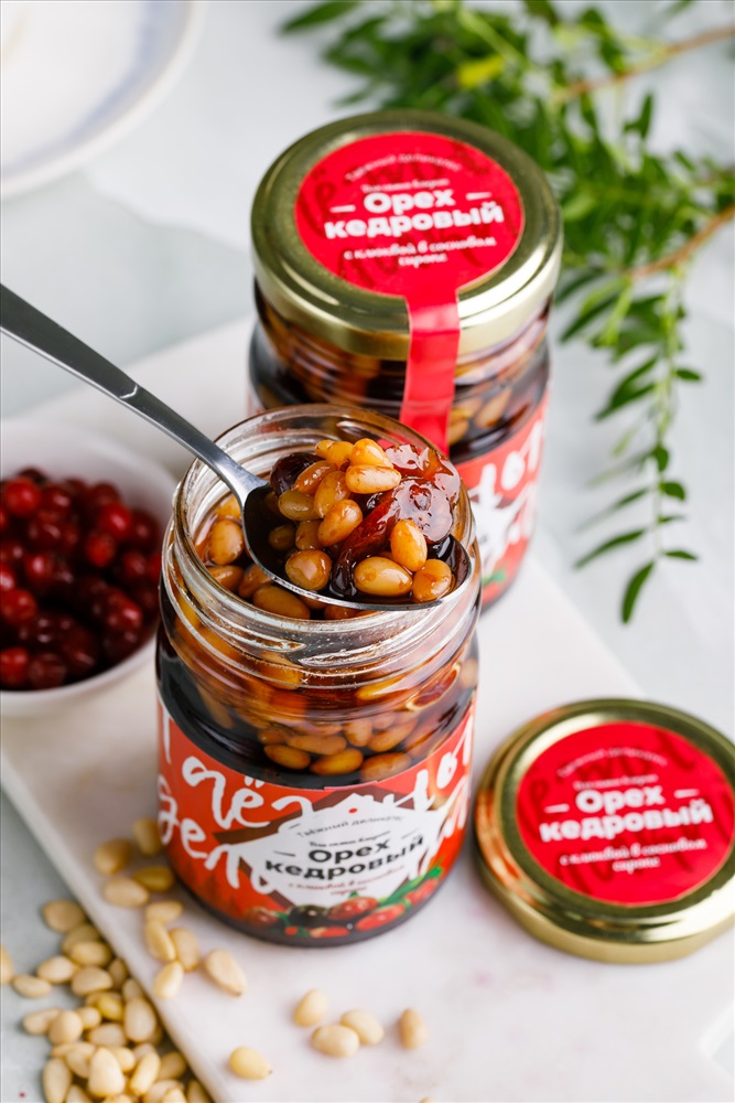 Кедровый орех и клюква в сиропе — это не только восхитительный вкус, но и множество полезных микроэлементов и витаминов. Особый процесс приготовления делает орехи мягче и сочнее, а сладкий сироп, приготовленный из тростникового сахара и молодых зеленых шишек, придаёт этому деликатесу уникальный аромат. Добавьте немного здоровья и радости в свой рацион, наслаждаясь этим удивительным сочетанием!