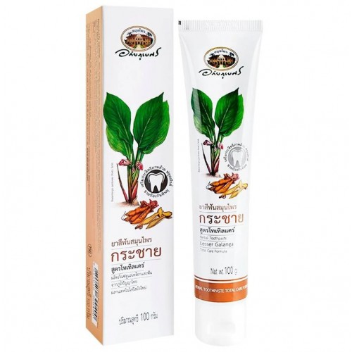 Тайская травяная зубная паста с Альпинией Галанга Abhaibhubejhr Lesser Galanga Total Care Formula 100gr Зубная паста с галангалом и лечебными травами Abhaibhubejhr — это сочетание традиционных тайских рецептов и современных технологий для здоровья зубов и десен. Паста эффективно борется с причинами кариеса, предотвращает образование зубного налета, помогает при пародонтозе и других заболеваниях полости рта. Разработана и произведена госпиталем Chao Phya Abhaibhubejhr — одним из самых авторитетных медицинских учреждений Таиланда, известным своими натуральными средствами. Объем 100 г. В составе зубной пасты: