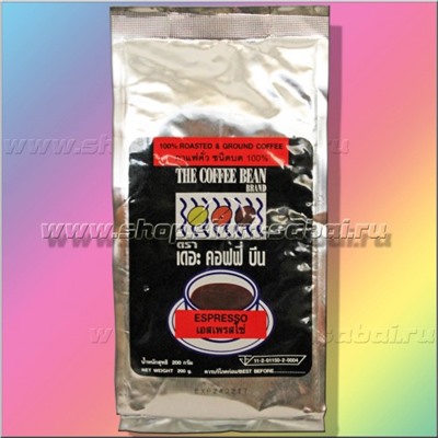 Тайский кофе молотый Эспрессо 200 грамм ROASTED & GROUND COFFEE ESPRESSO Молотый тайский кофе Эспрессо, самый популярный в мире вид кофе, универсального помола как для кофеварок, так и для заваривания в турке, от тайского кофейного бренда компании The Coffee Bean Brand. Тайский кофе «Эспрессо» - это смесь кофейных зерен сортов арабика и робуста с классической темной обжаркой зерен. Кофе получается с приятной горчинкой, терпковатый, немного с «дымком». Тайский кофе Эспрессо «The Coffee Bean Brand» упакован по всем правилам сохранения аромата кофейных зерен, пакет состоит из двух слоев фольги с полиетиленовой прокладкой. Вес нетто кофе молотого Эспрессо 200 грамм, кофе выращен и упакован в Таиланде. Тайский молотый кофе Эспрессо подходит как для турки, так и для кофемашины и кофеварки. Комментарии к товару