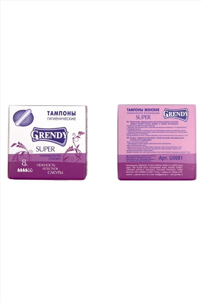 Модель: Тампоны GRENDY женские гигиенические Супер 8шт. Арт.U0081 Тип товара: тампоны Бренд: Grendy Впитываемость: 4 капельки Тампоны женские гигиенические впитывающие ТМ GRENDY. Предназначены для использования в качестве средств личной гигиены женщин в период менструации. Верхний слой тампонов покрыт шелковистым нетканым материалом, что предотвращает отслаивание волокон. Закругленный кончик и шелковистый слой обеспечивают деликатное введение тампона. Благодаря натуральным волокнам, тампоны впитывают больше жидкости и обеспечивают надежную защиту от протекания. Состав: вискозное полотно, нетканый материал, шнур (полиэстер/хлопок). Таблица размеров и веса