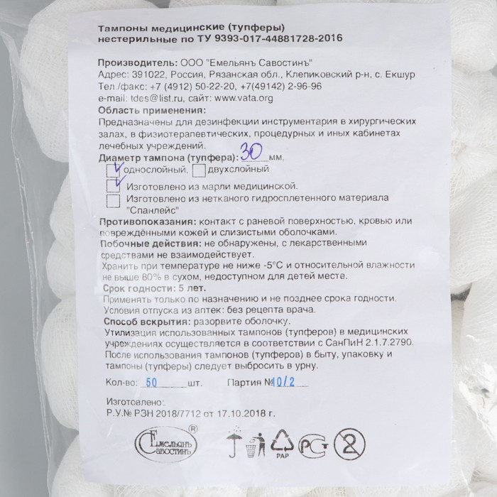 Габариты: 21 x 15 x 4 Страна: Россия В боксе: 100 набор В наборе: 50 набор Состав: См. на упаковке Материалы: см. на упаковке Фасовка: по 1 набор Индивидуальная упаковка: Без упаковки Сертификат: Не подлежит сертификации Диаметр, мм: 30 В упаковке, шт.: 50 Фиксированная цена: Да Используются в медицинских учреждениях, процедурных кабинетах, стоматологии. Применяются для остановки кровотечений, осушения раны, впитывания биологической жидкости, прижатия, обработки кожи вокруг ран. Не имеют ворсистой поверхности, все кромки находятся внутри изделия. Изготовлены из хлопчатобумажной марли плотностью 32 - 52 г/м2. Комментарии к товару