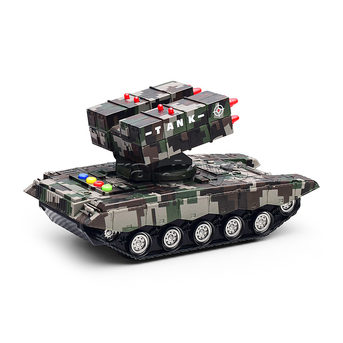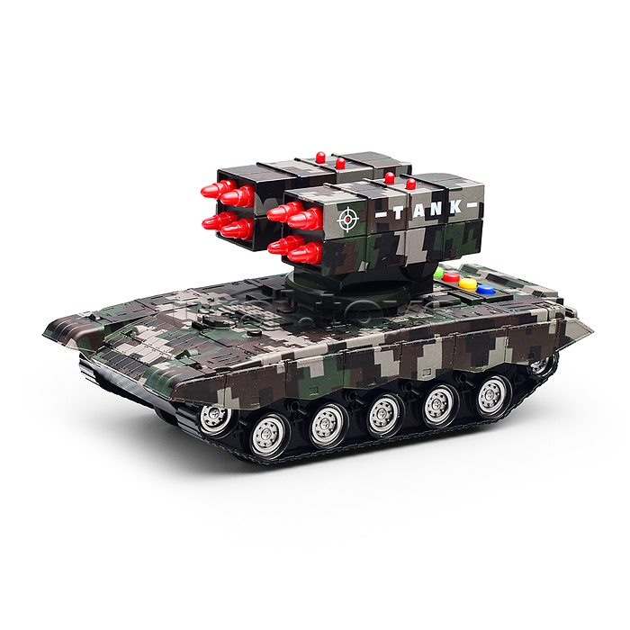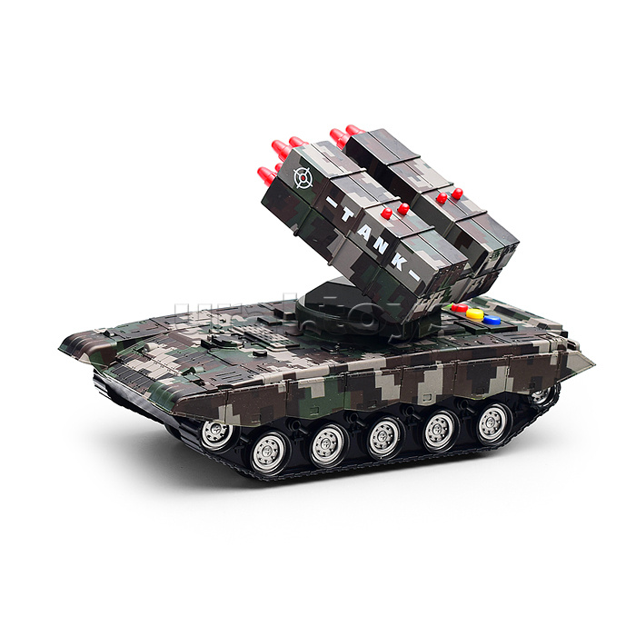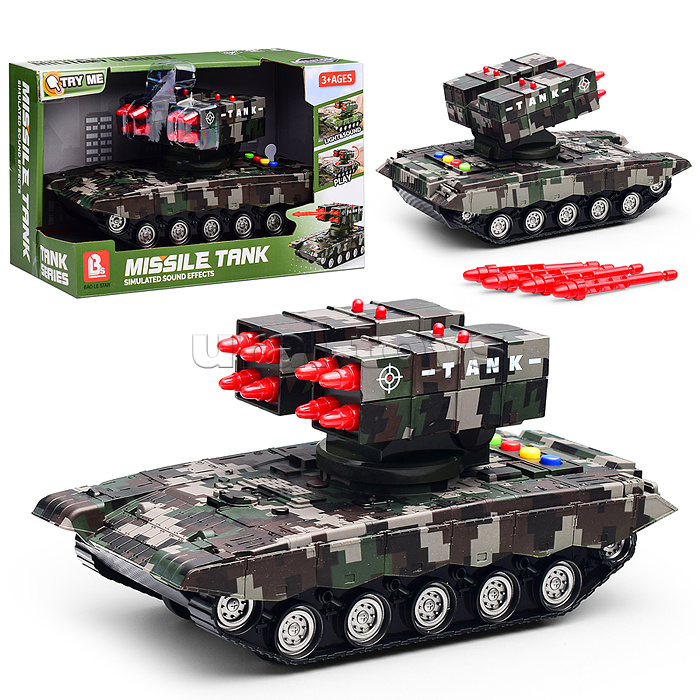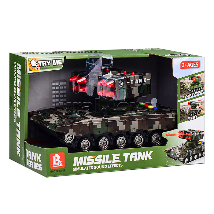 • Размеры игрушки: 25х12х12.5 см. • Инерционный механизм движения. • Башня поворачивается на 360 градусов вправо и влево. • При нажатии кнопок на башне, выстреливает снаряд (4 снаряда в комплекте) • Эффекты (при нажатии кнопок на корпусе): - звук движения танка. - звук выстрела. - звук сирены. - свет фар. • Свет и звук работают от 3-х батареек "LR44" (входят в комплект для демонстрации) • Материал: пластик. • Соответствует требованиям безопасности продукции. • Для детей от 3-х лет.