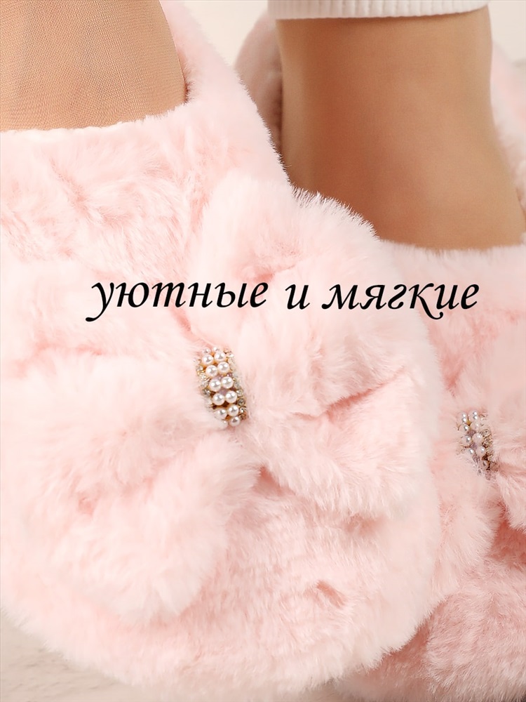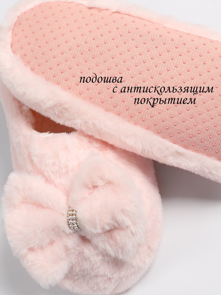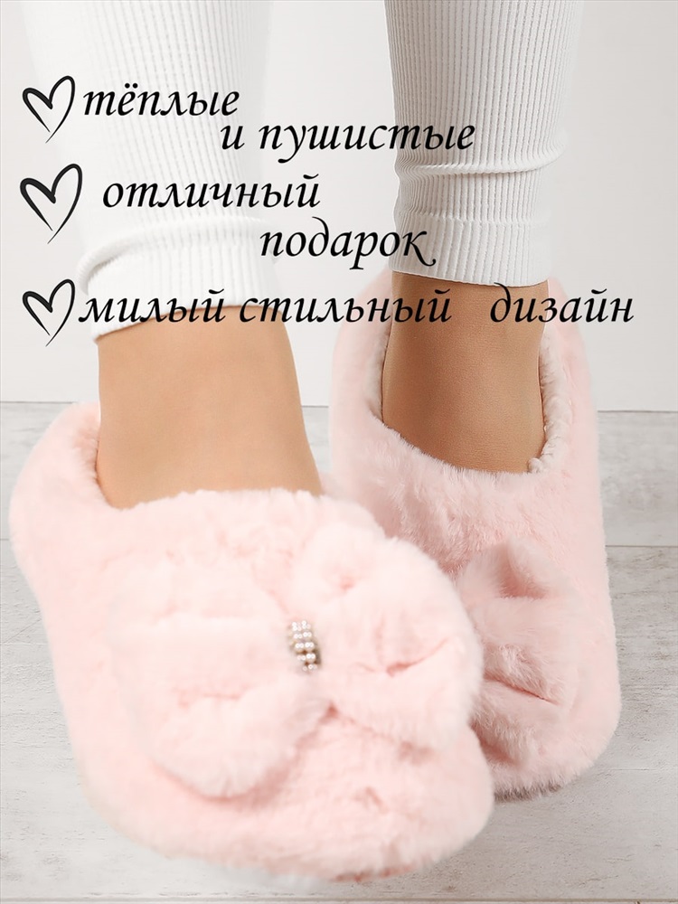Тёплые тапочки из искусственного меха на меховой подкладке, украшенные бантиком со стразами. Прекрасно согреют и подарят максимальный комфорт в холодное время года. Подошва с антискользящим покрытием.