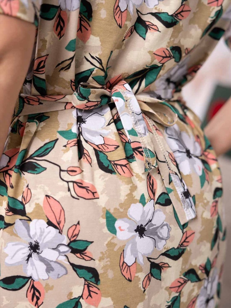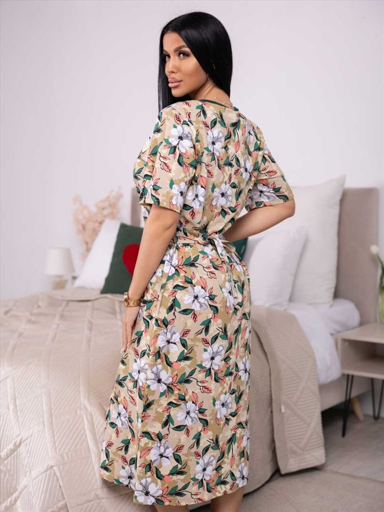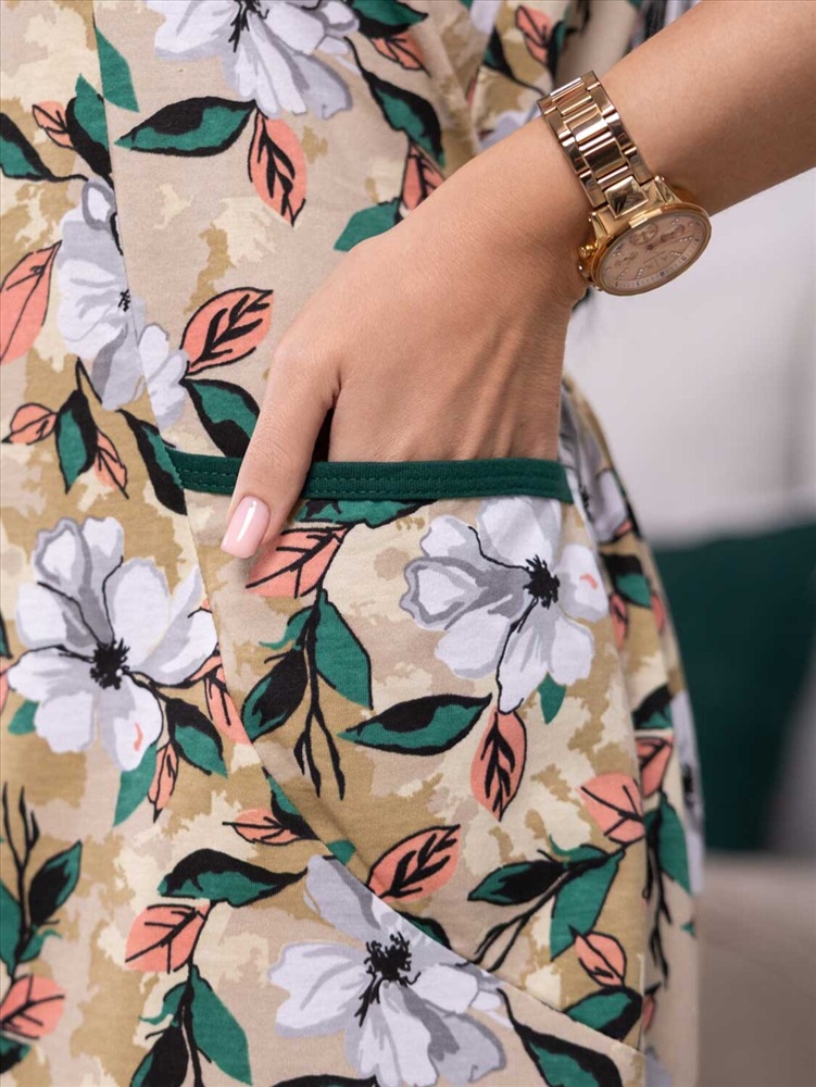 Халат женский из трикотажного полотна - кулирка, длиной ниже колена, прямого силуэта. Полочка с рельефами и карманами в них. Рукав втачной базового покроя длиной до линии локтевого сгиба.