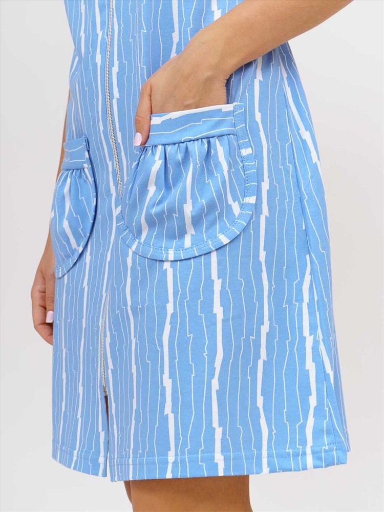 Халат женский полуприлегающего силуэта из трикотажного полотна, длиной до уровня колена. На полочке два накладных кармана со сборкой. Изделие без рукава. Вырез горловины О-образный. Проймы, горловина и карманы обработаны окантовкой.