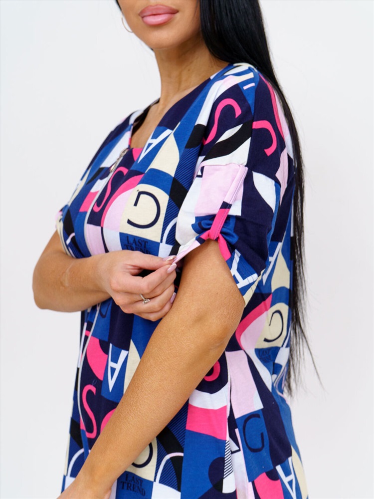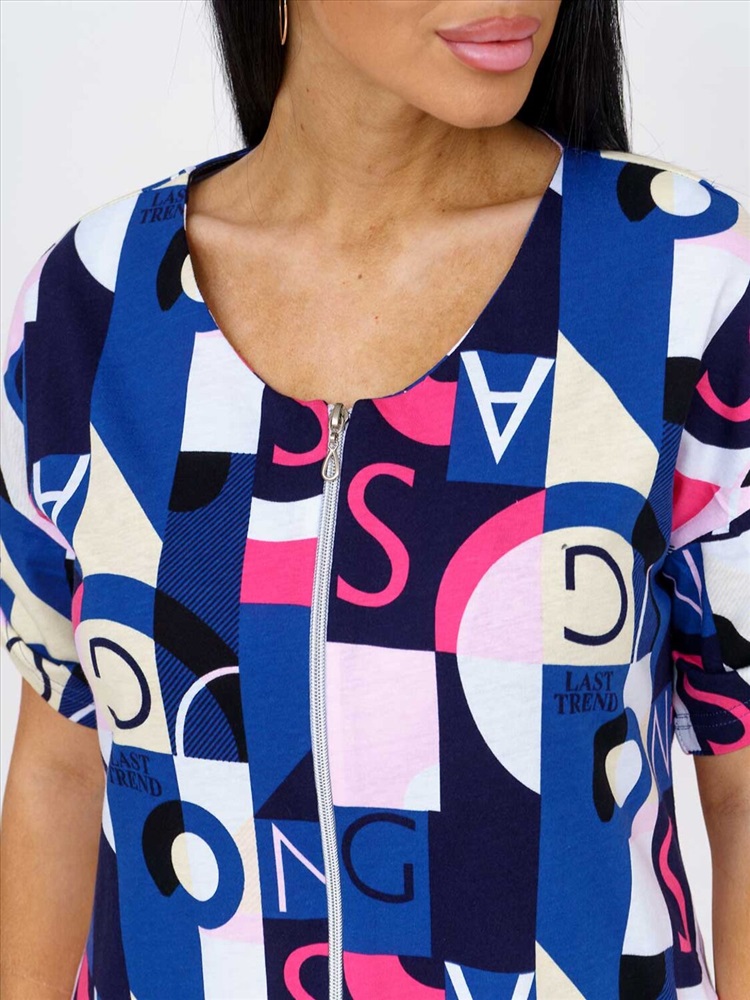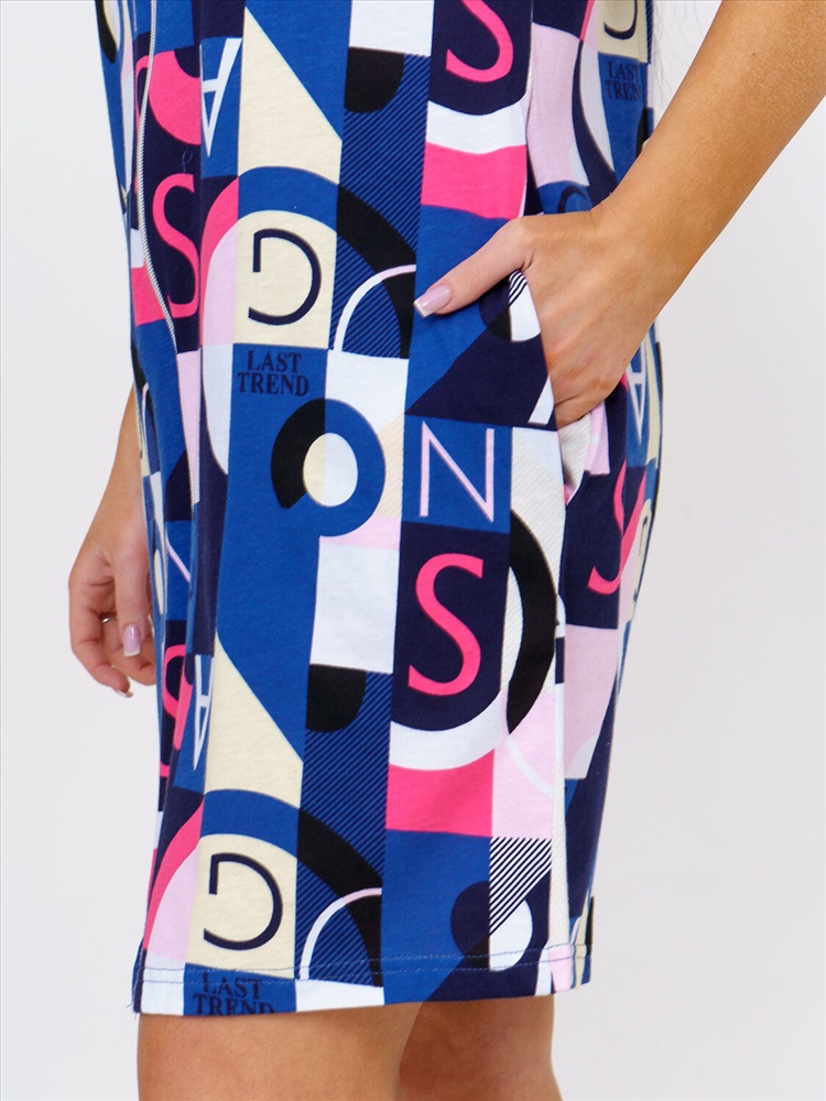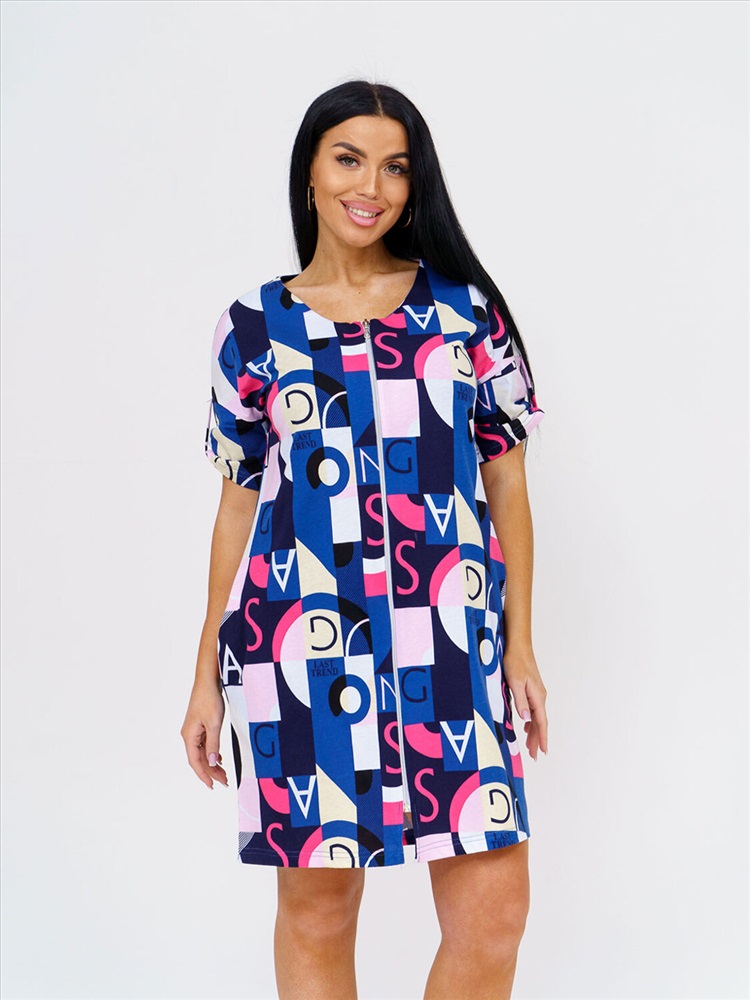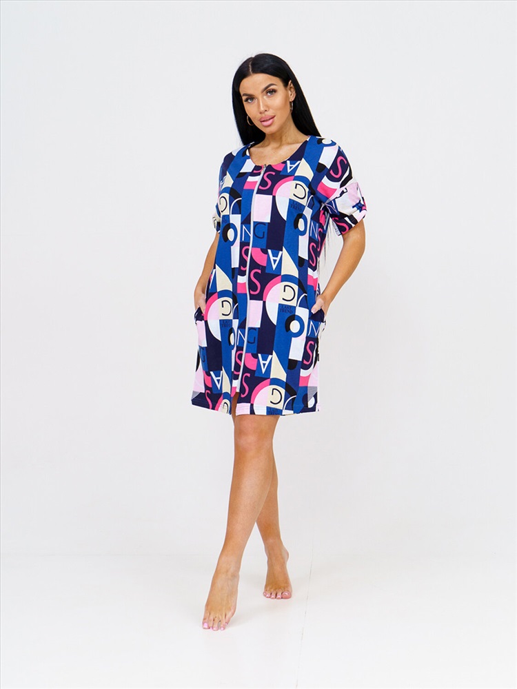 Халат женский из трикотажного полотна - кулирка, длиной выше колена, прямого силуэта. С карманами в боковых швах. Рукав - втачной, длиной 1/2.