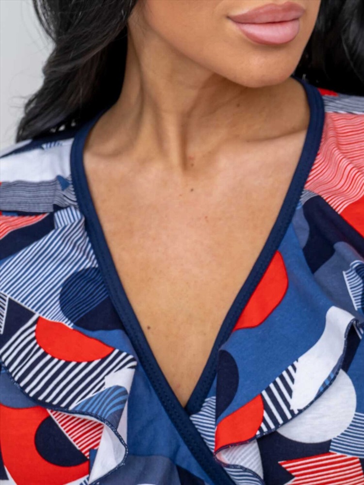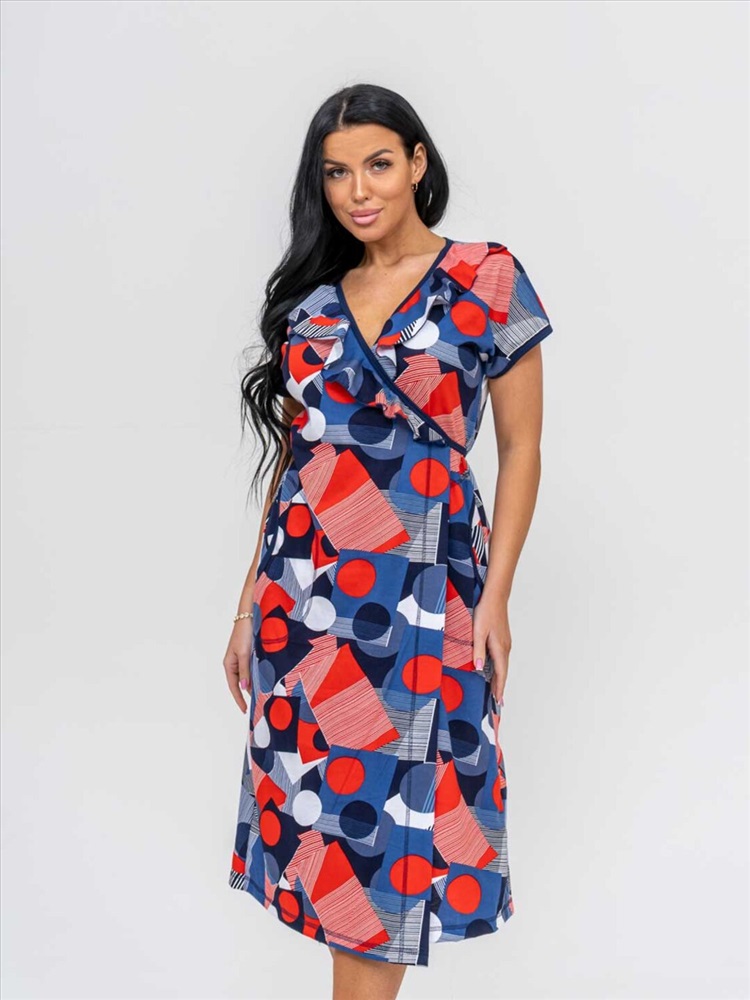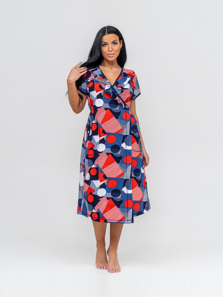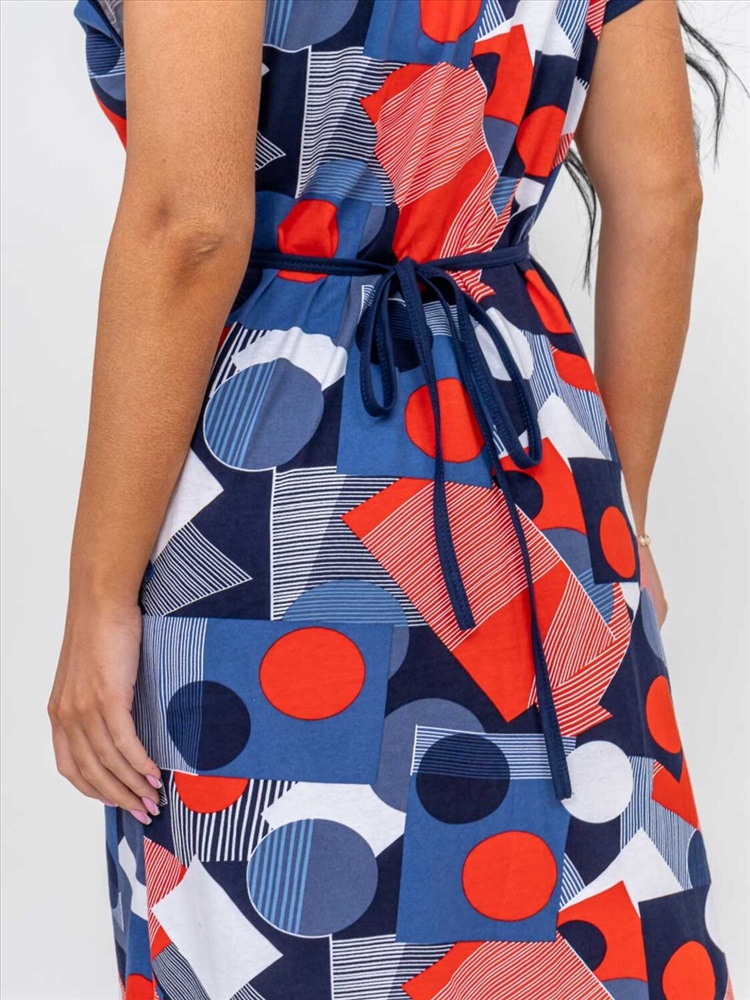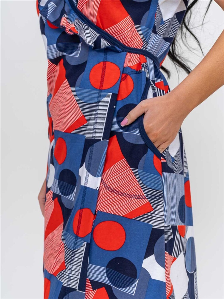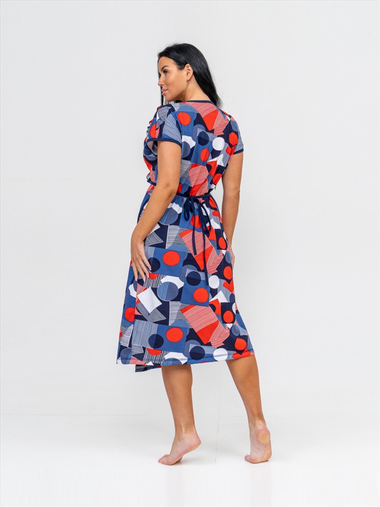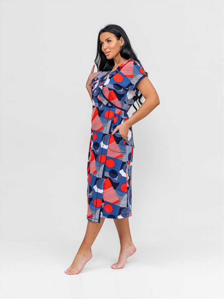 Халат женский полуприлегающего силуэта из трикотажного полотна «кулирка». Изделие на запах, на завязках, с цельнокроеным рукавом, V-образной горловиной и карманами в боковых швах.