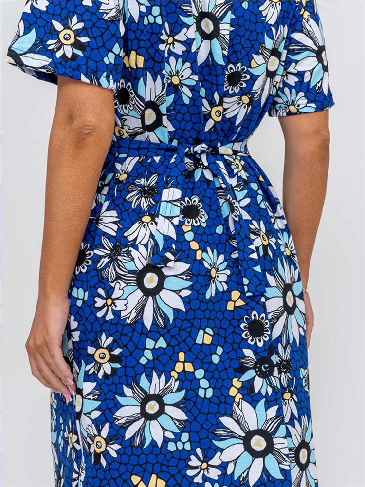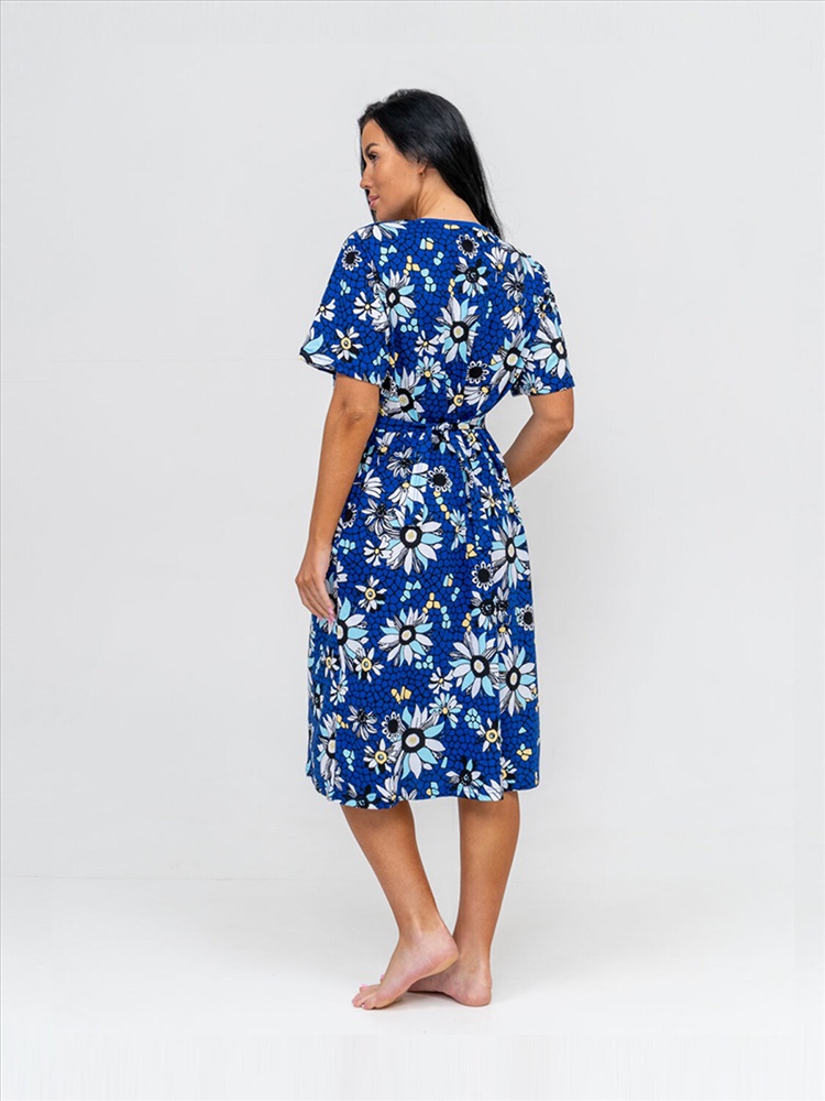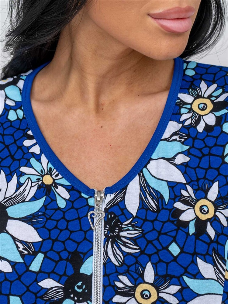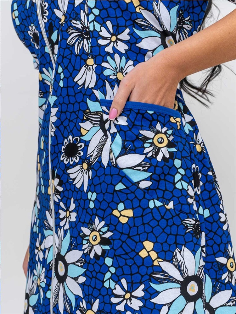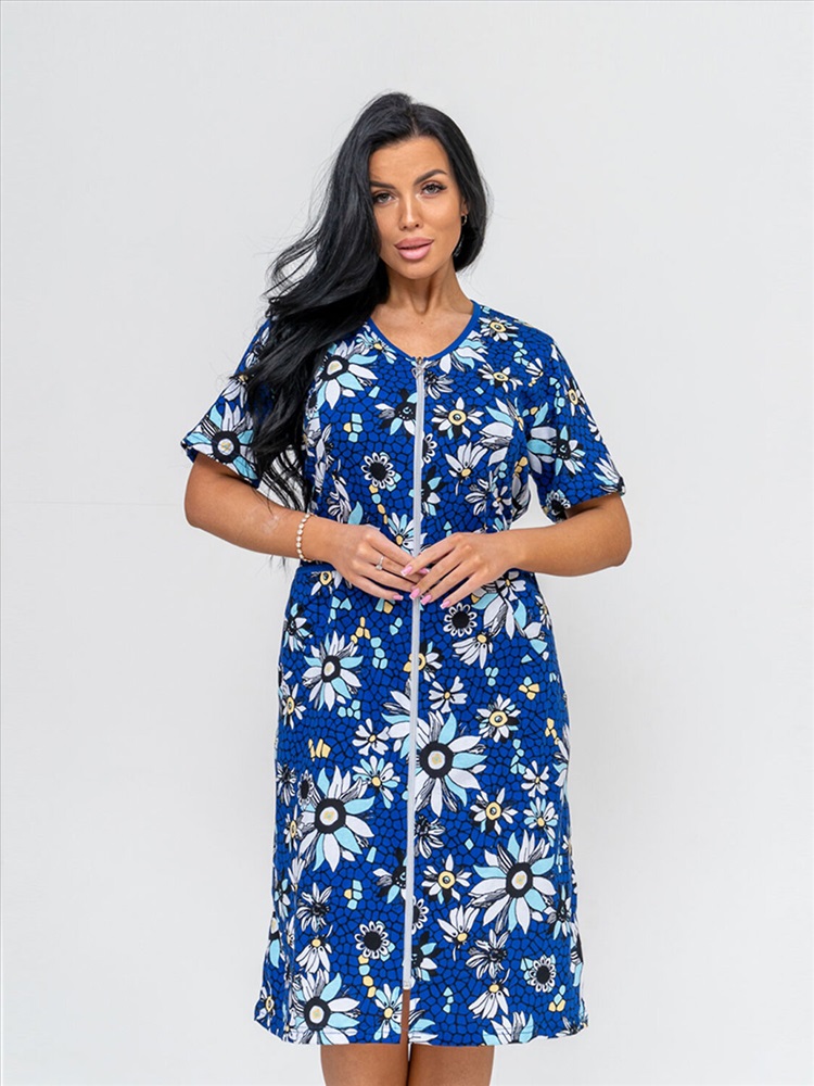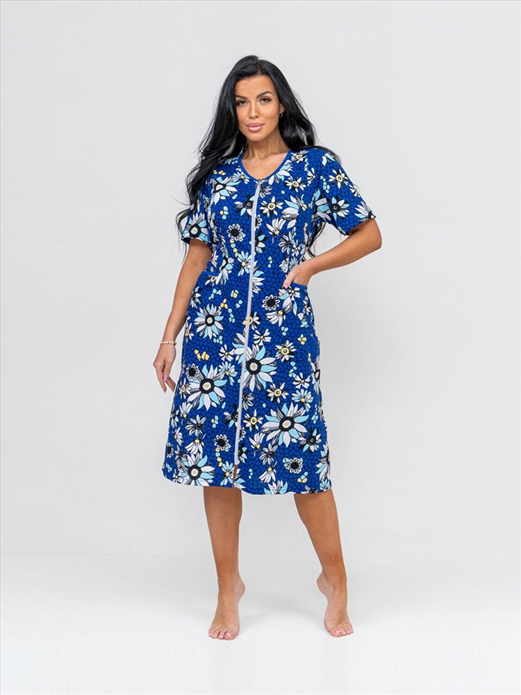Халат женский из трикотажного полотна - кулирка, длиной ниже колена, прямого силуэта. Полочка с рельефами и карманами в них. Рукав втачной базового покроя длиной до линии локтевого сгиба.