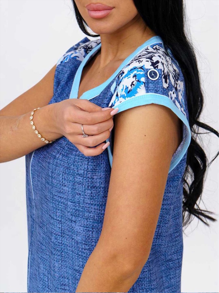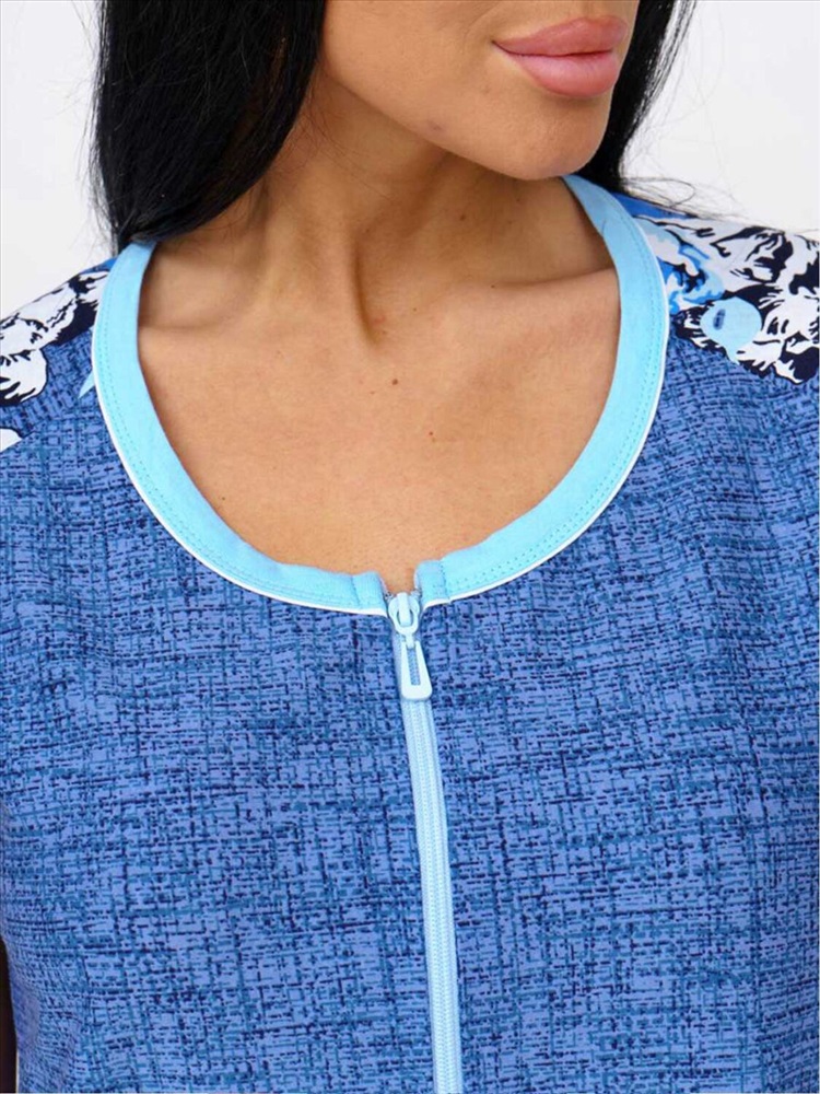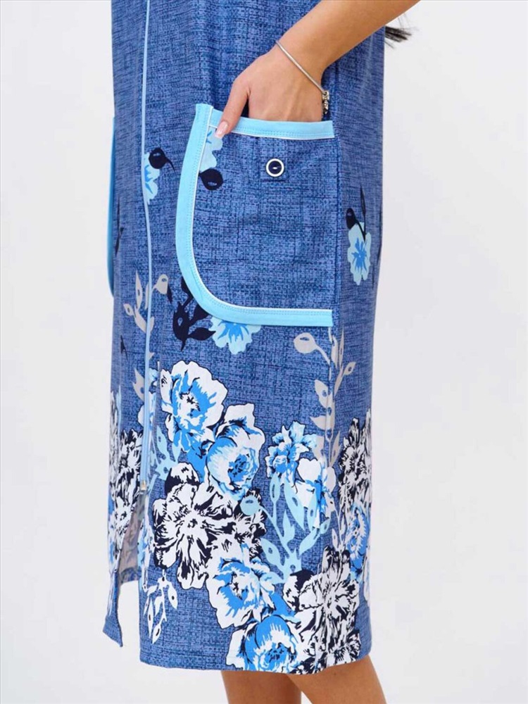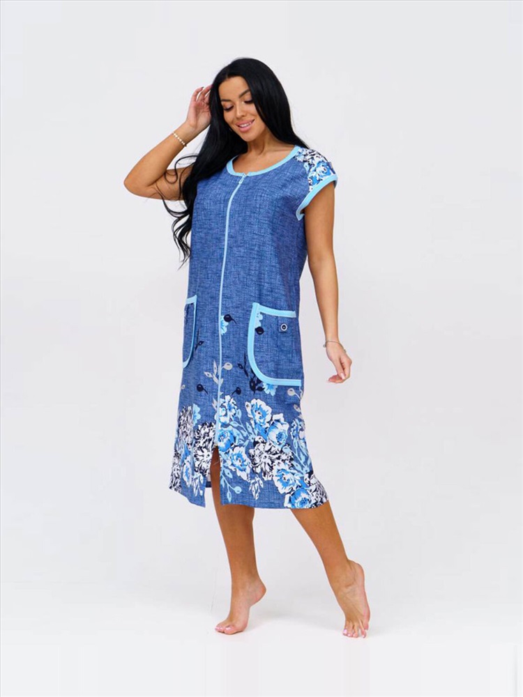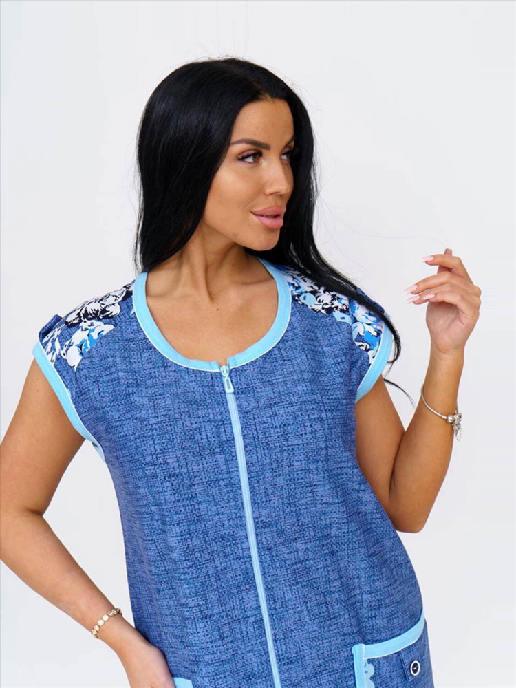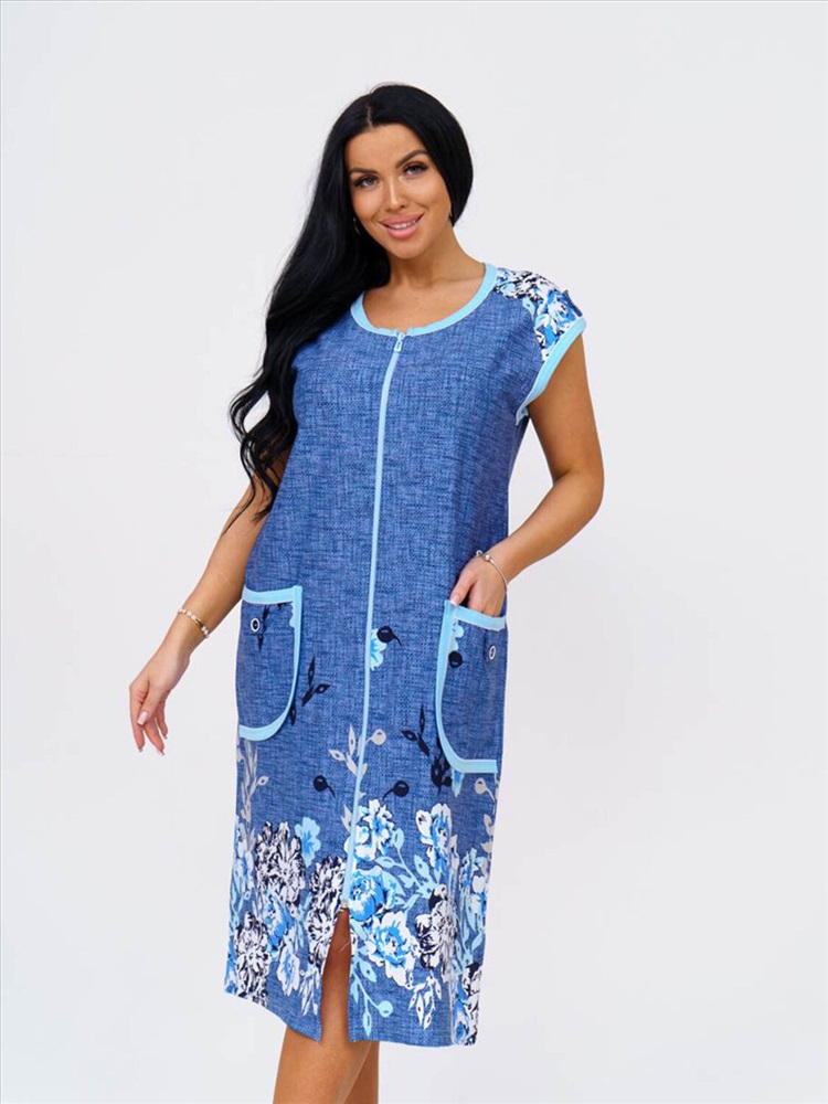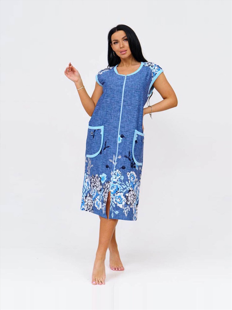 Халат женский из трикотажного полотна - кулирка, прямого силуэта с застёжкой на молиню. Полочка с накладными карманами, со вставками по плечевым срезам. Проймы, горловина и карманы обработаны окантовкой.