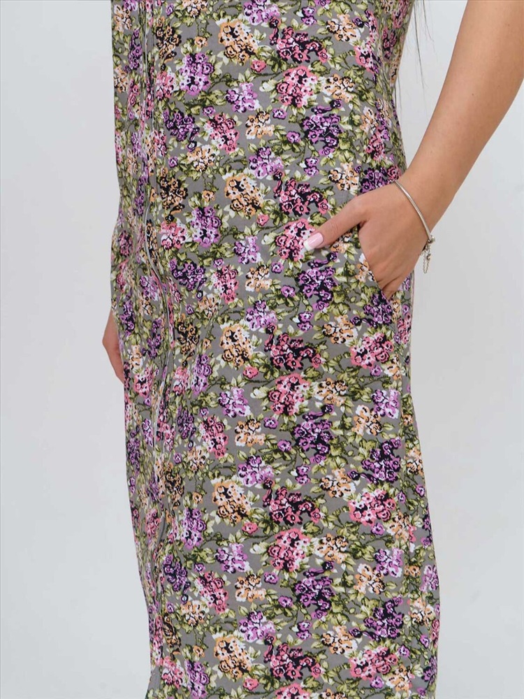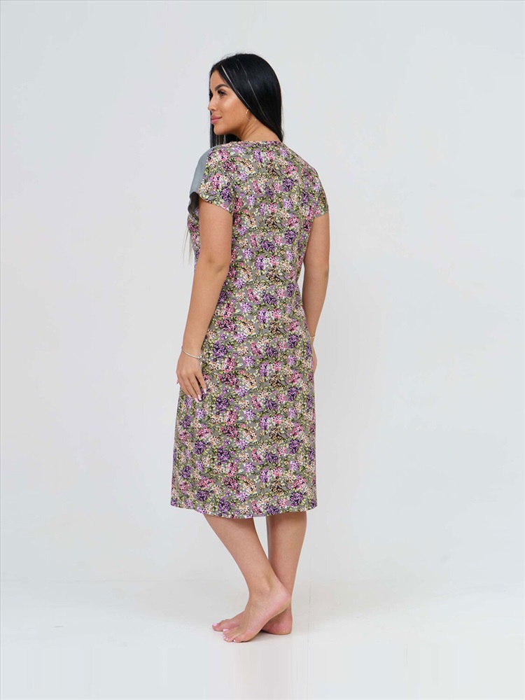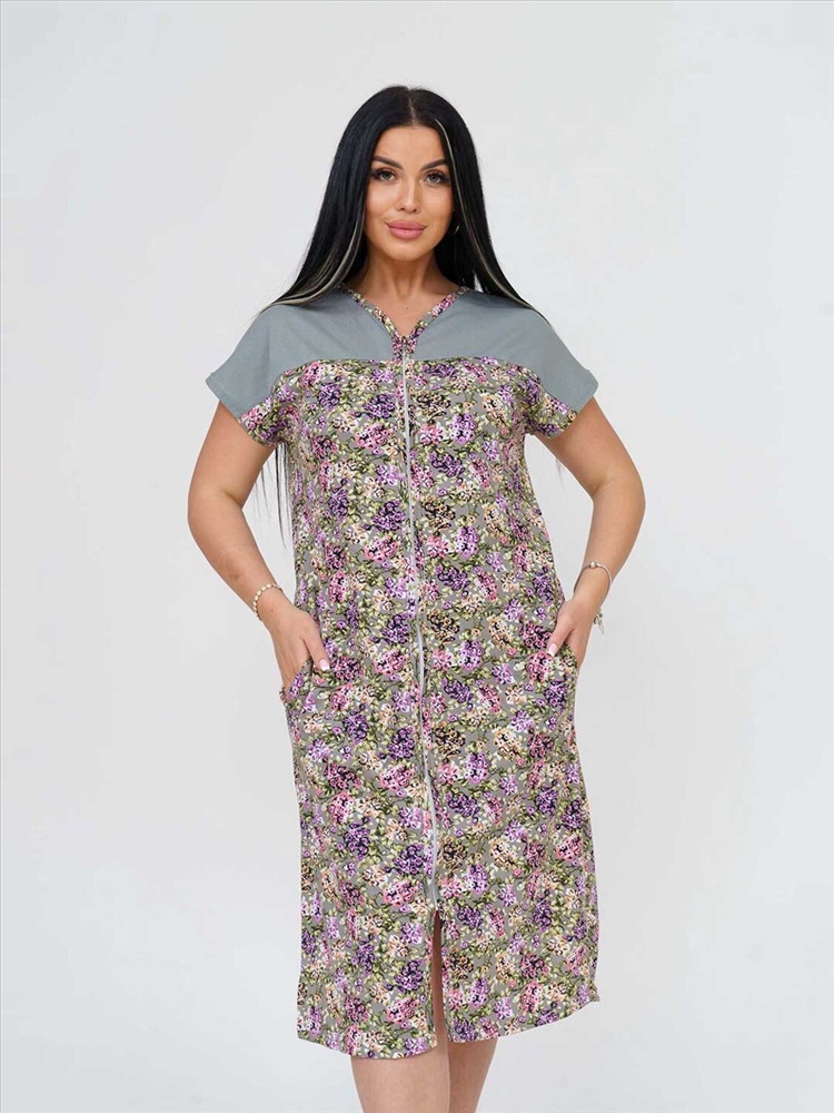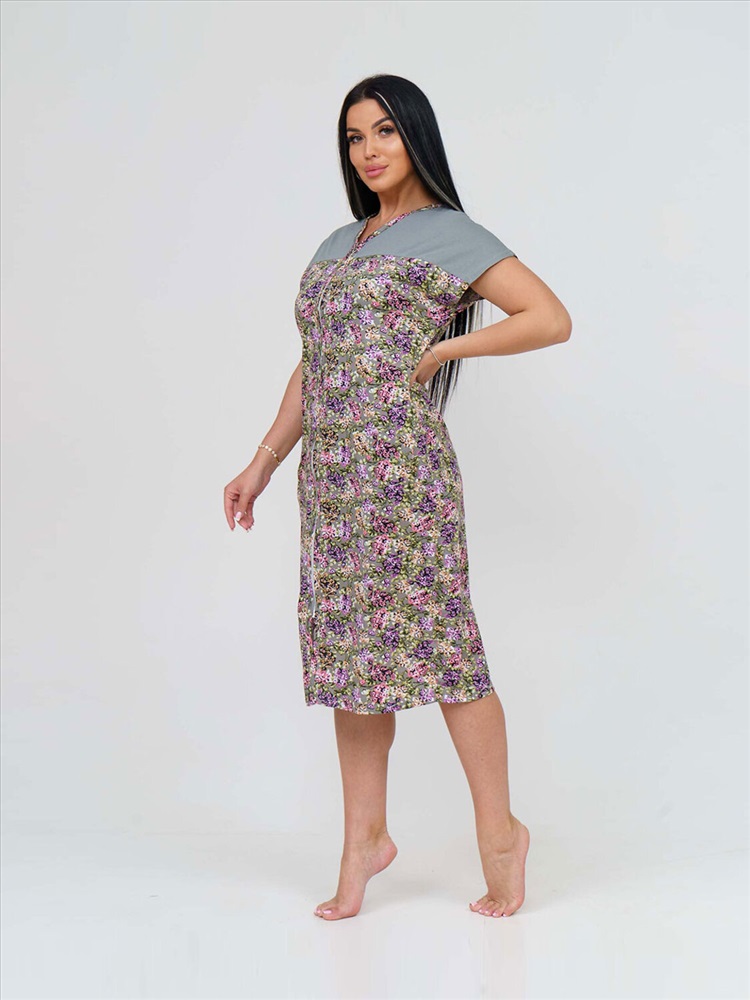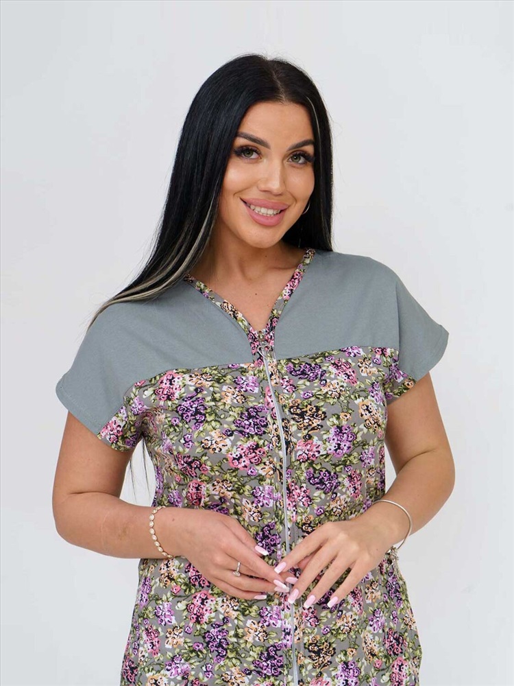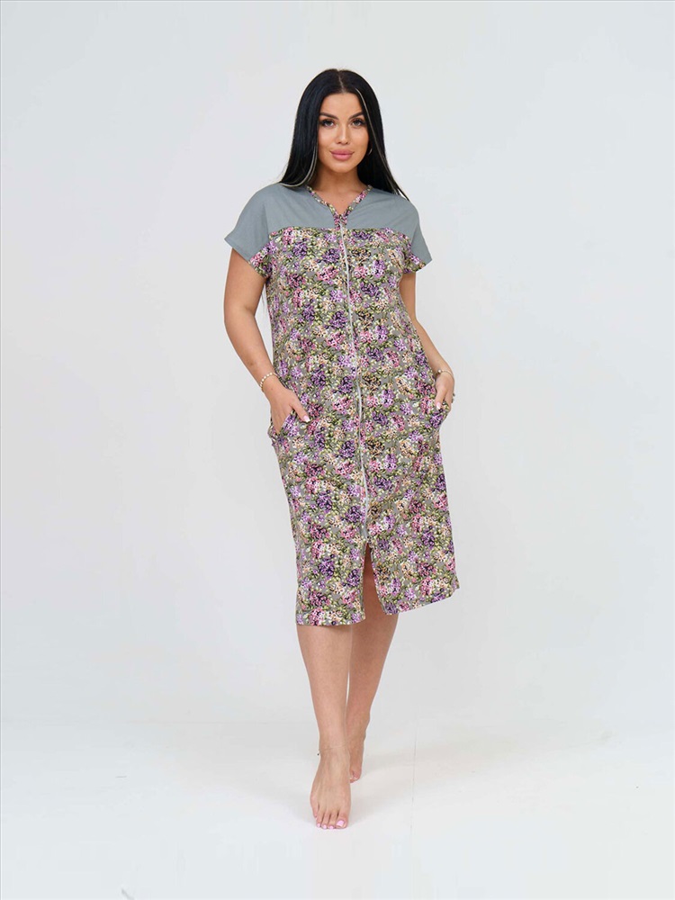 Халат женский из трикотажного полотна - кулирка, прямого силуэта с застёжкой на молнию. Полочка с цельнокроёным коротким рукавом, кокеткой, карманами в боковых швах и V-образной горловиной.