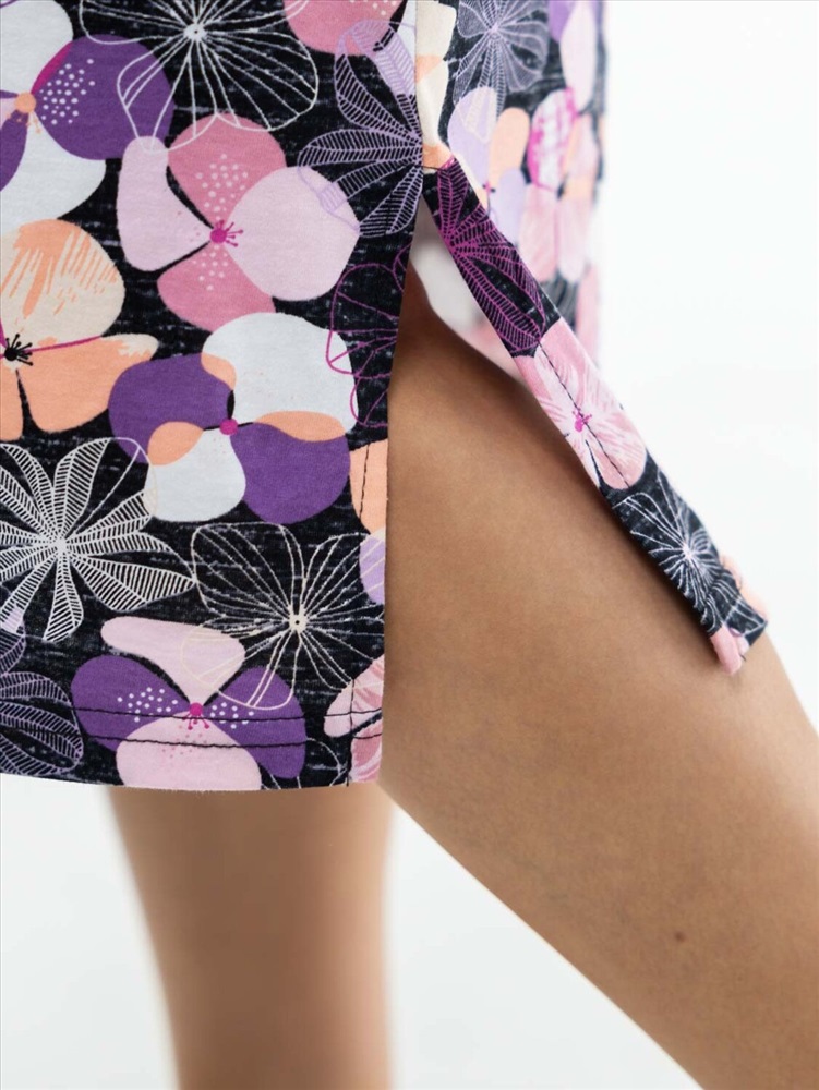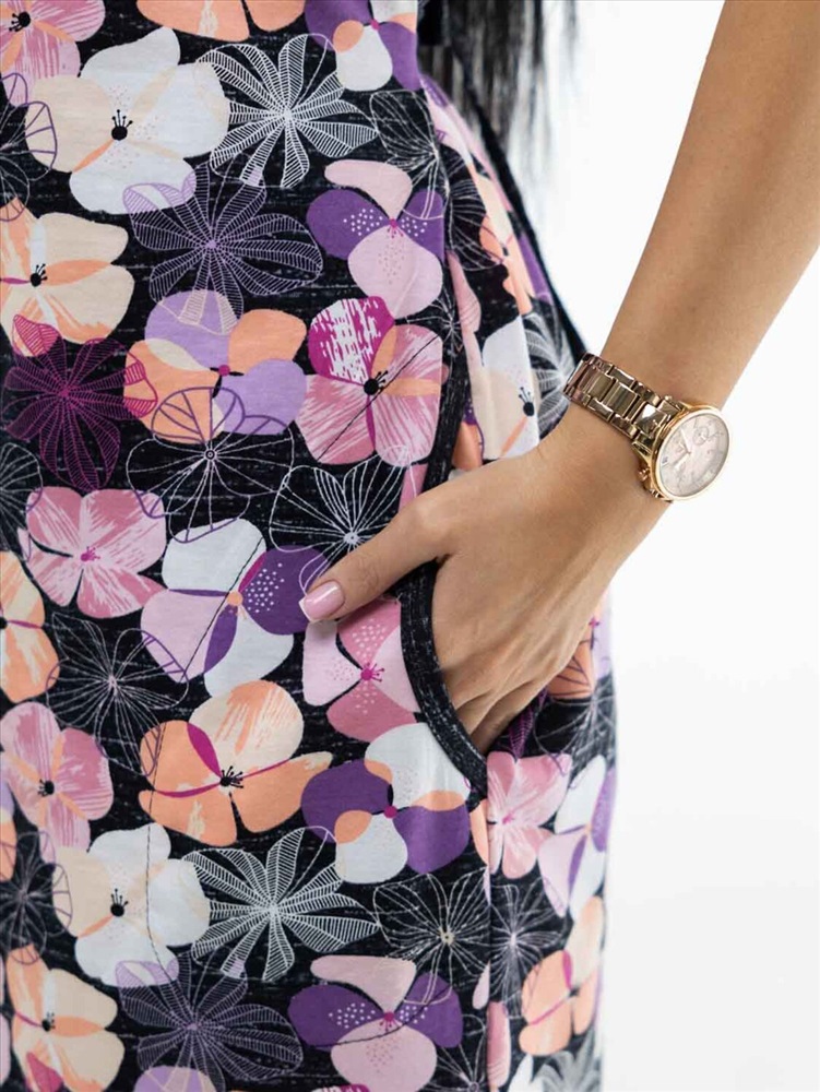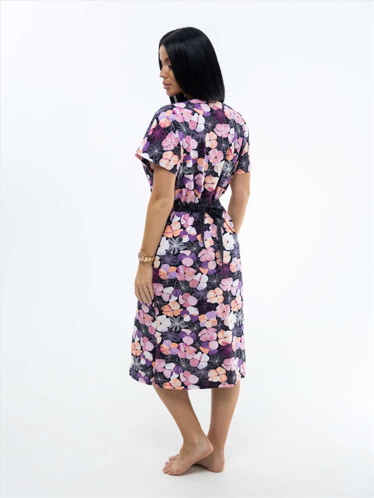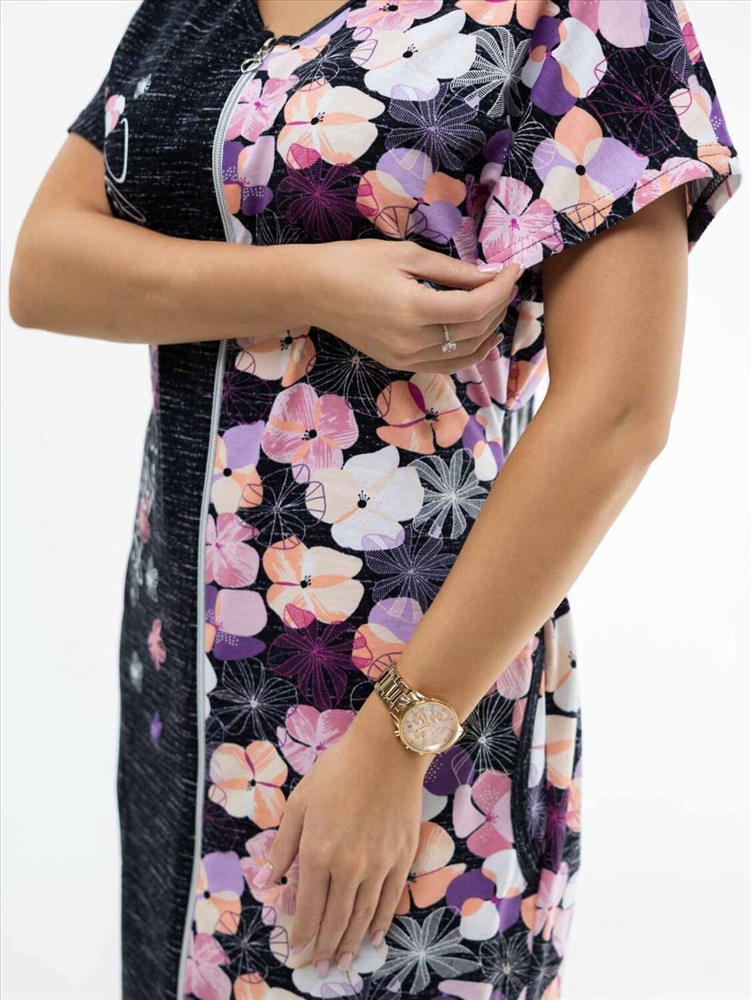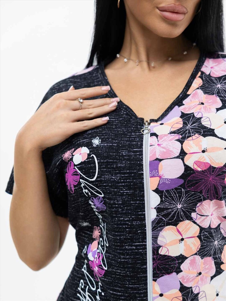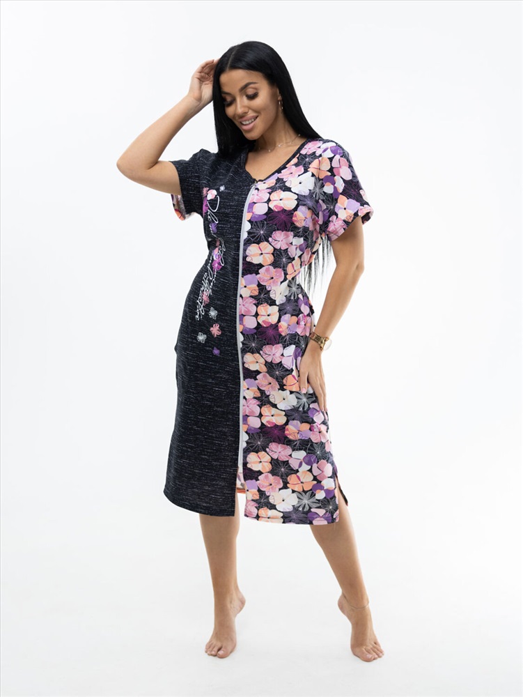 Халат домашний на молнии, с цельнокроенным рукавом и округлой горловиной. В боковых швах удобные карманы. В нижней части - вырезы, для большей свободы движения. На спинке имеются завязки, для регулировки ширины изделия по талии.