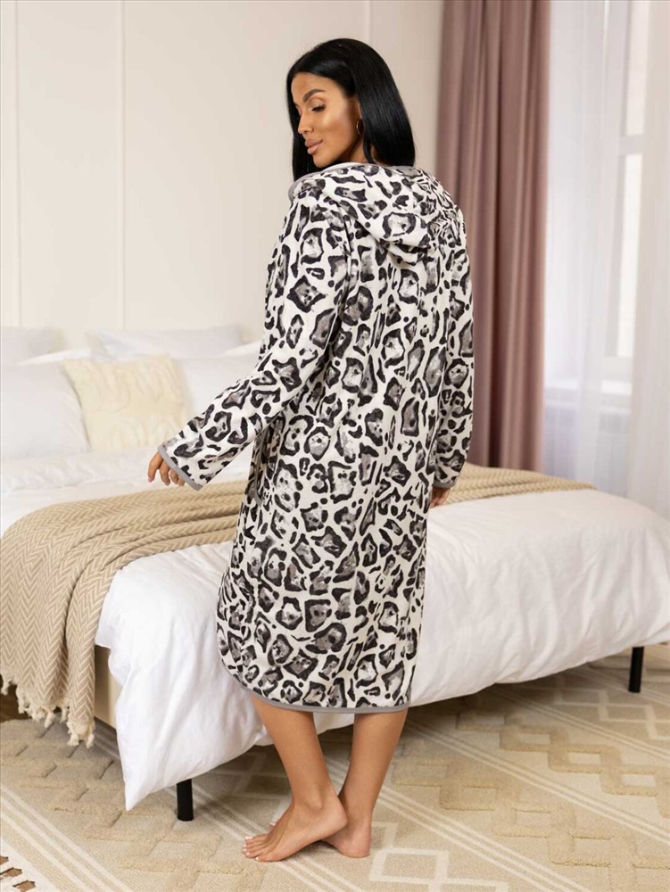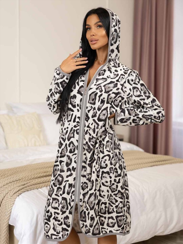 Женский махровый халат с капюшоном и надежной застежкой на молнию. Длина изделия, чуть ниже уровня колена. Удобные карманы с отрезным бочком. Наиболее уязвимые при носке места изделия: низ халата, рукава и карманы окантованы, что значительно увеличивает срок службы халата.