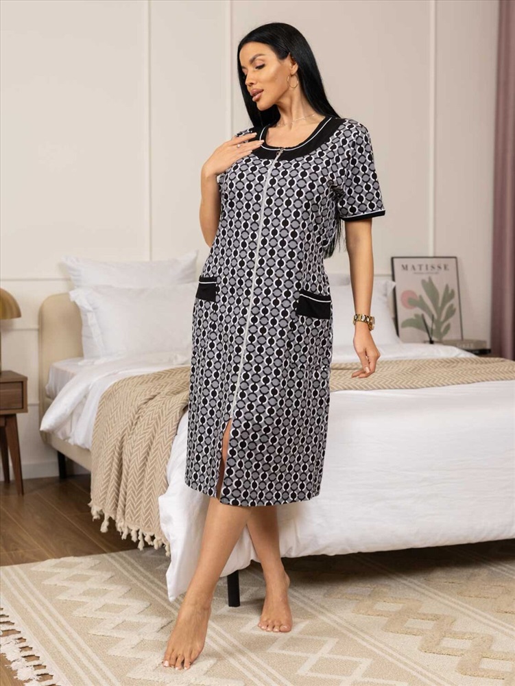 Халат из кулирки на молнии приталенного силуэта с контрастной отделкой по накладным карманам, горловине и рукавам. Халат средней длины, с пояском сзади. Рост модели на фото 165см.