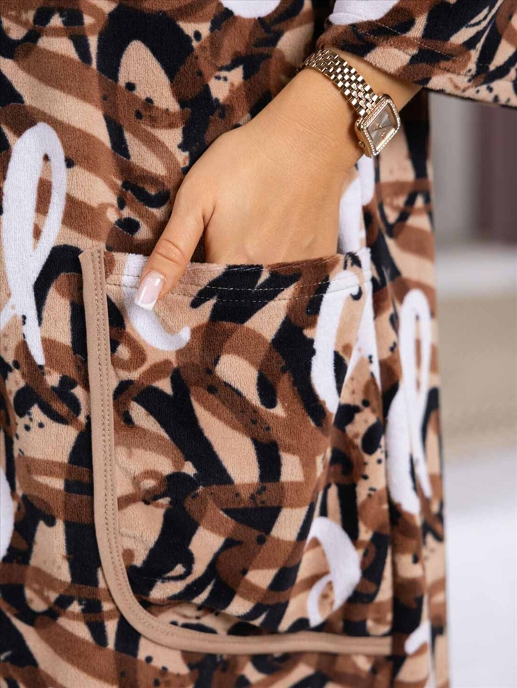 Халат женский трикотажный, длиной ниже колена. Данная модель имеет отложный воротник и застежку на молнию. Рукав - втачной, длиной 3/4. Большие удобные накладные карманы.